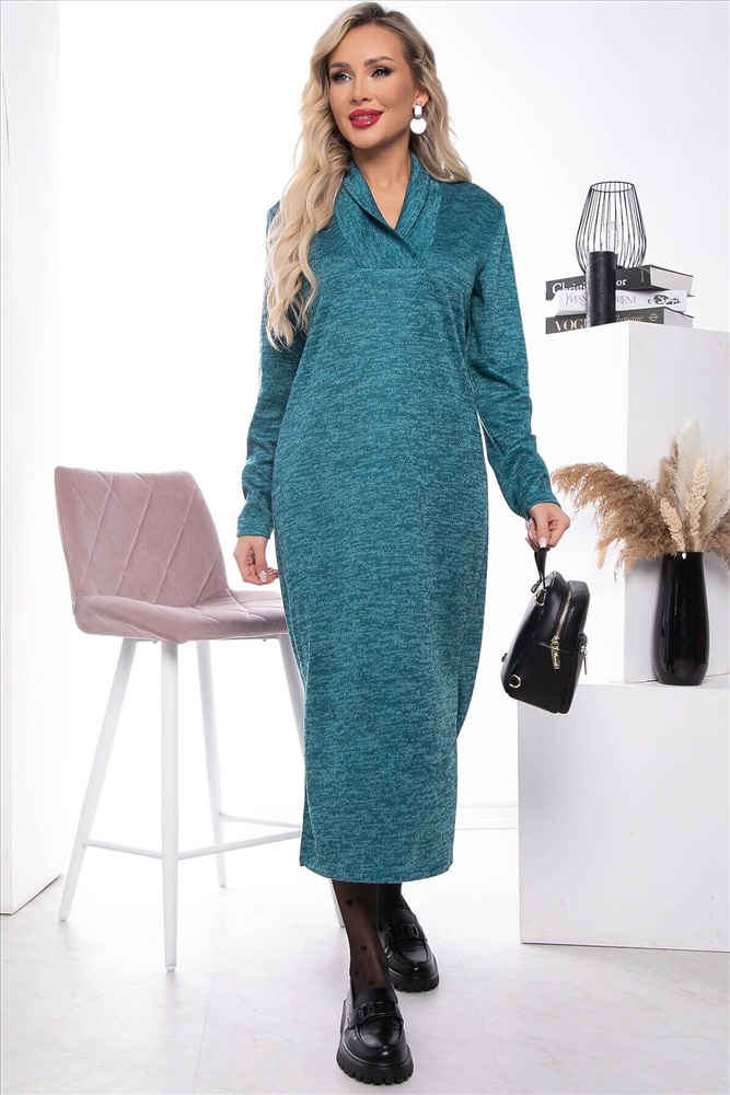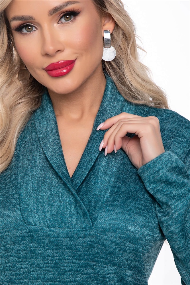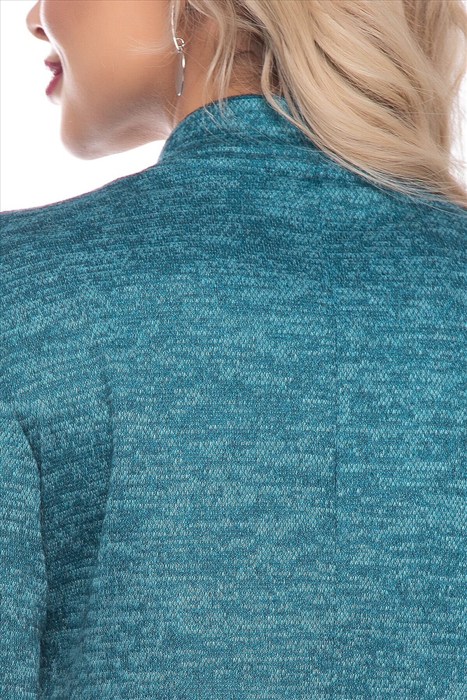 Артикул: П7605. Ткань: меланж. Состав: 60% п/э, 35% вискоза, 5% эластан. Цвет: бирюзовый. Вид застежки: без застёжки. Силуэт: прямой. Карманы: отсутствуют. Тип горловины: воротник-стойка. Длина изделия по спинке: 46-54/ 110 см.