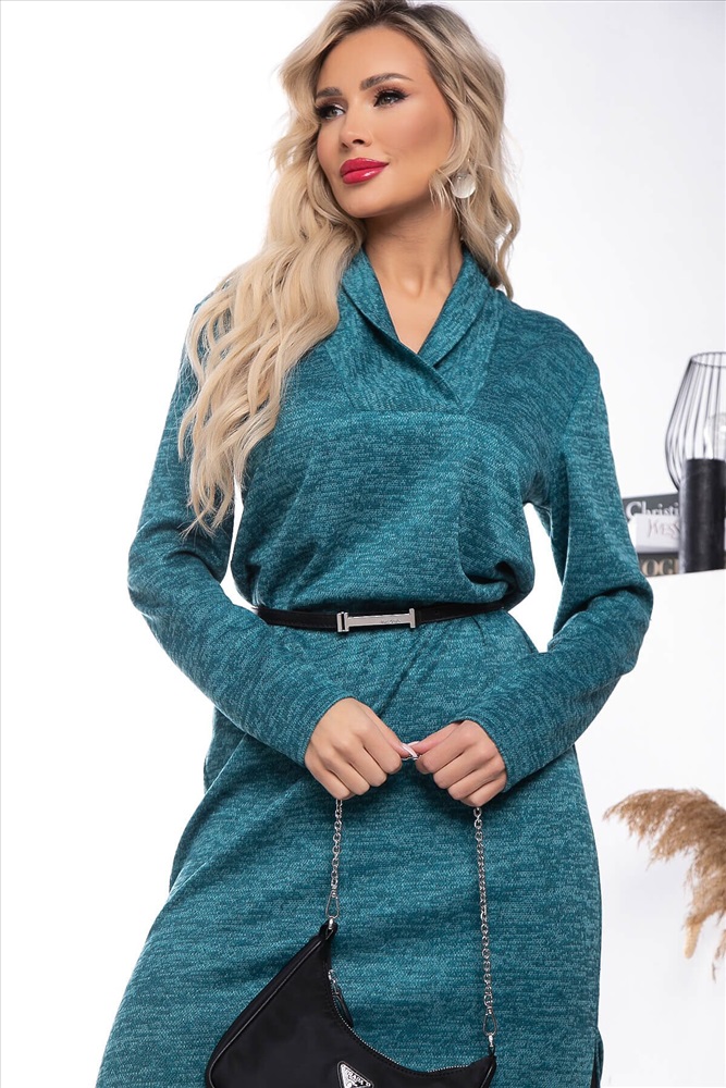 Платье из меланжа в стильном оттенке прекрасно подойдёт для модных и при этом комфортных повседневных образов. Благодаря простой форме такое платье прекрасно сочетается со многими вещами из женского гардероба. Рукав длинный, втачной. По низу в в боковых швах разрезы. В комплект входит ремень с пряжкой.