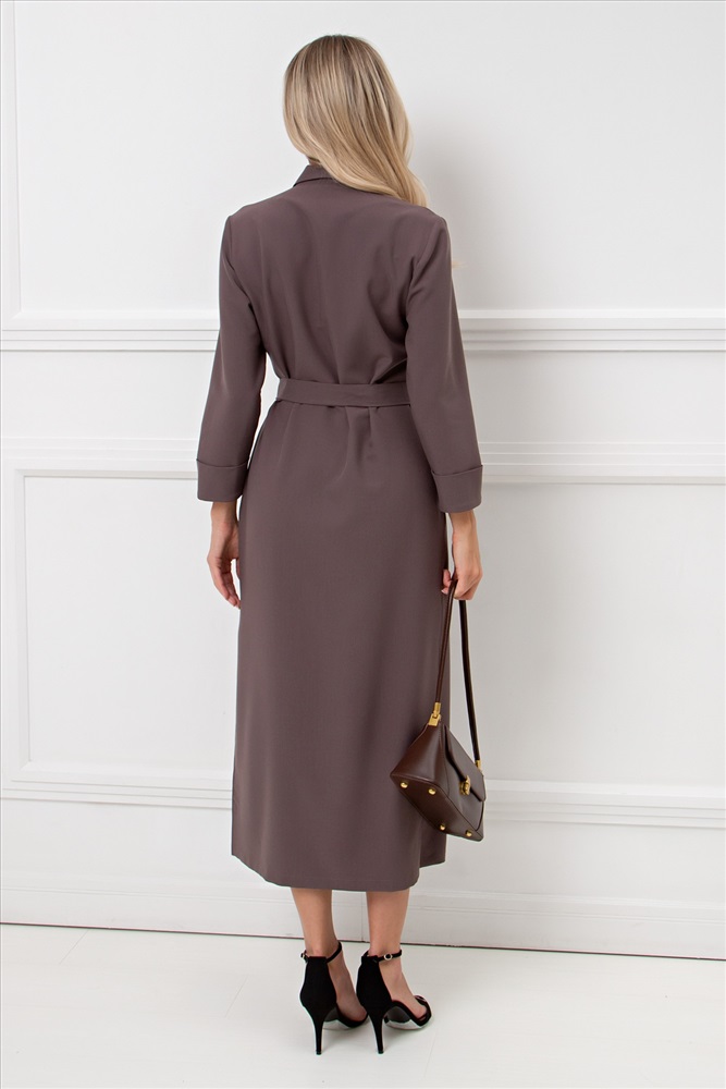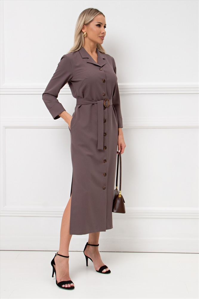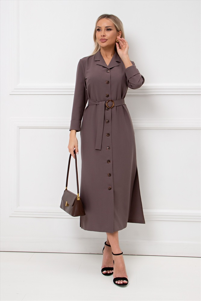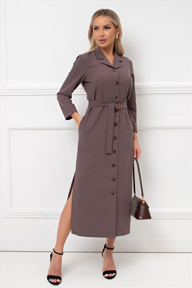 Лаконичное платье-рубашка прямого кроя выполнено из плательно-костюмной ткани.V-образная горловина оформлена отложным воротником. По переду застежка на петли и пуговицы. Рукав втачной, длиной 7/8. В боковых швах функциональные карманы. Низ ровный, по бокам разрезы. Пояс из основной ткани в комплекте.