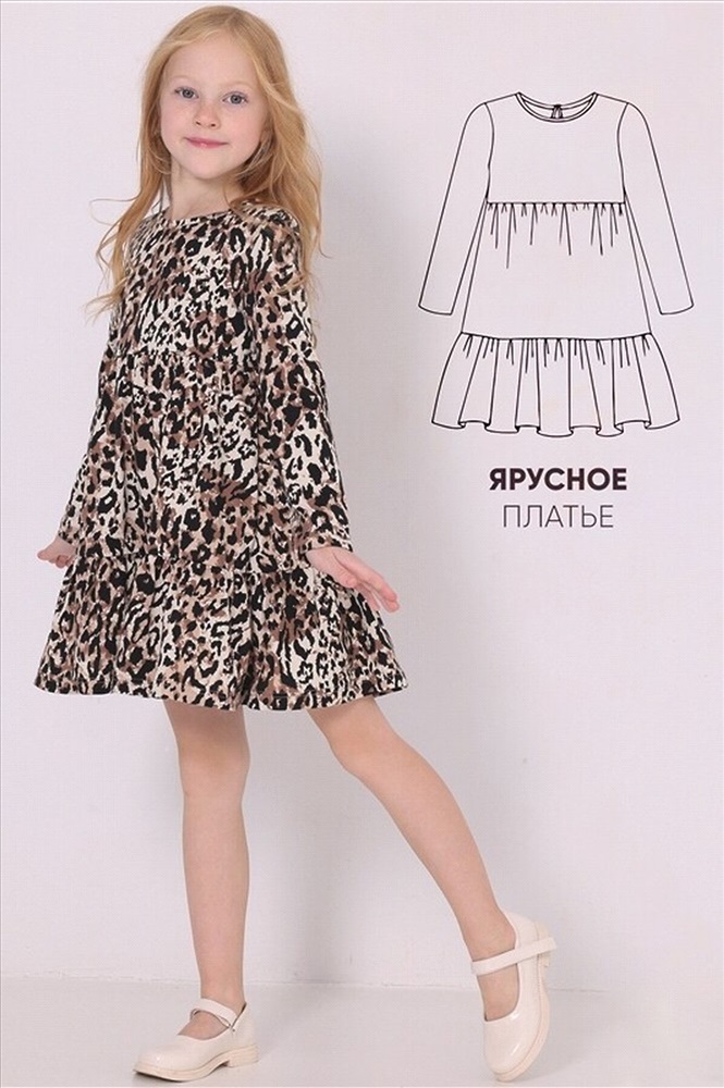 Платье для девочки выполнено из кулира – лёгкого хлопкового полотна. Изделие трапециевидного силуэта, отрезное по талии с длинными рукавами, застежка по спинке на пуговицу, юбка украшена широким воланом. Уход: только машинная стирка (руками не стирать!) при температуре 40 градусов, без предварительного замачивания. Тип полотна - кулир