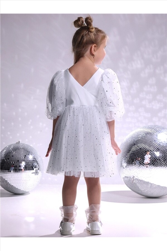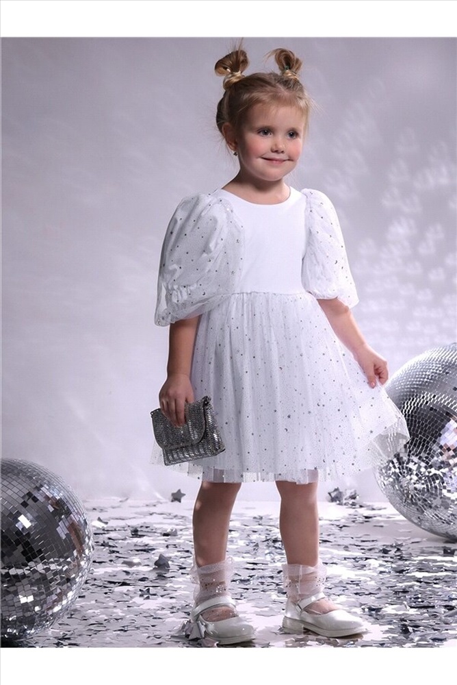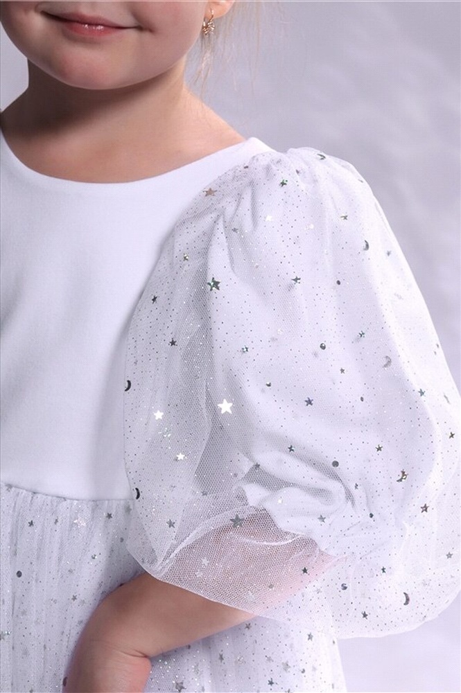 Нарядное платье для девочек из тонкого хлопкового полотна с лайкрой. Изделие отрезное по линии талии, с объемными двойными рукавами-фонариками и пышной юбочкой из сетки. Спинка с V-образным вырезом, выполнена на запАх. Сеточка украшена серебристыми звездочками. Уход: только деликатная стирка при температуре 40 градусов, без предварительного замачивания. Тип полотна - кулир с лайкрой