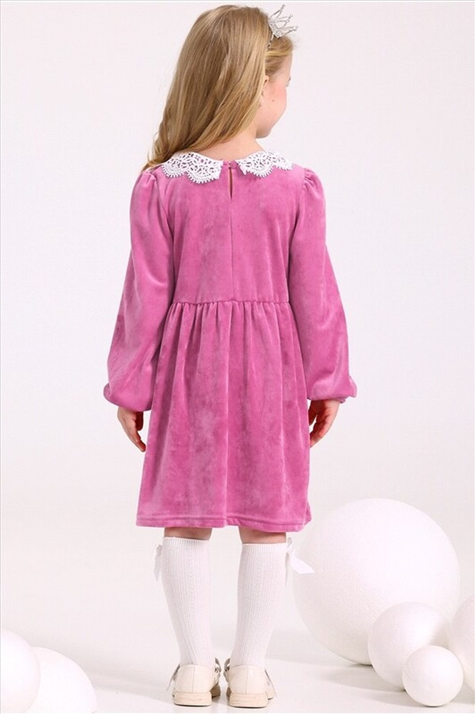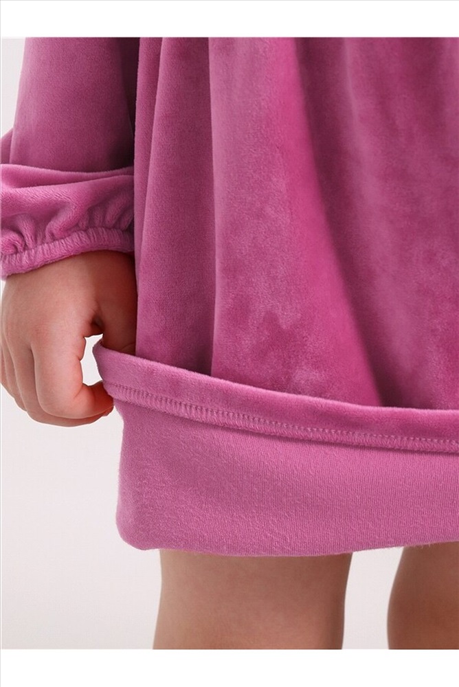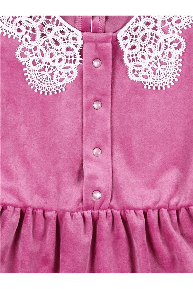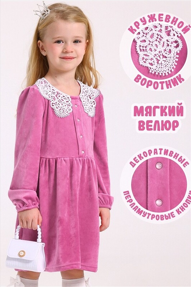 Платье для девочки выполнено из мягкого велюрового полотна. Изделие полуприлегающего силуэта, отрезное по линии талии с присборенной юбочкой, с длинными рукавами, собранными по низу на эластичную тесьму, застежка по спинке на пуговицу. Полочка платья украшена декоративной планкой с 4 перламутровыми кнопками и кружевным воротником. Уход: деликатная машинная стирка (руками не стирать!) при температуре 40 градусов, без предварительного замачивания. Изделия с печатью и декором перед стиркой необходимо вывернуть на изнаночную сторону.