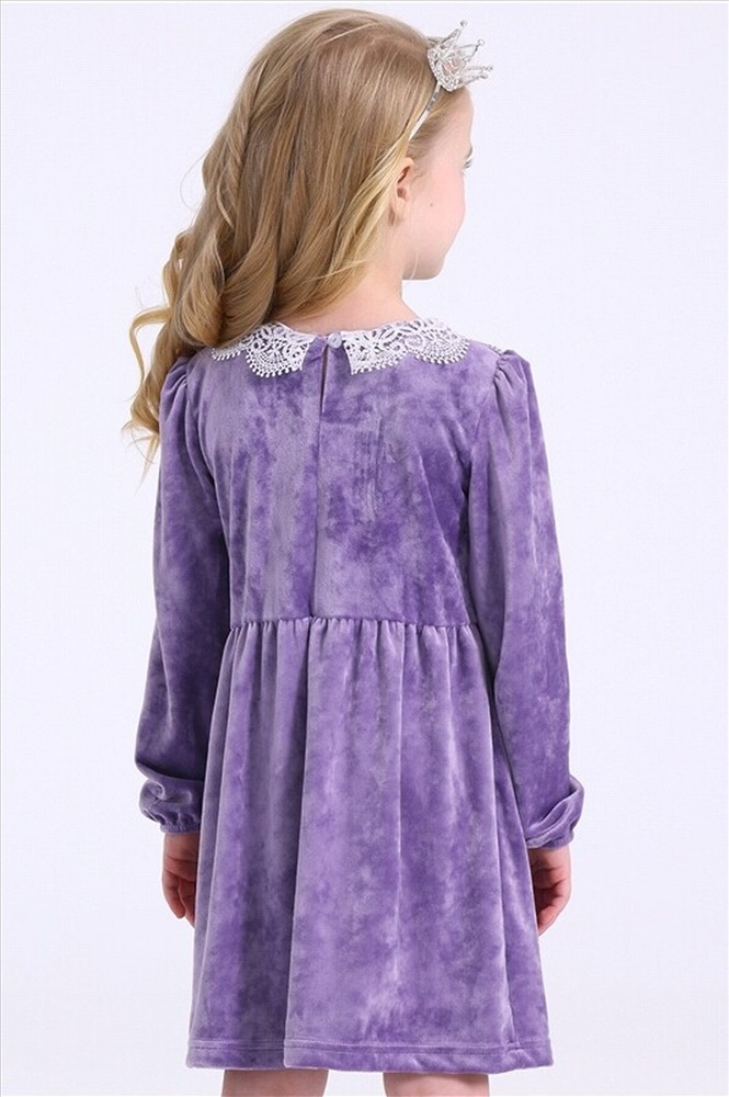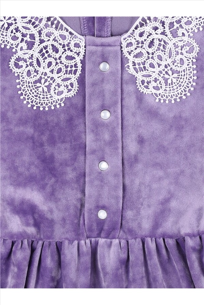 Платье для девочки выполнено из мягкого велюрового полотна. Изделие полуприлегающего силуэта, отрезное по линии талии с присборенной юбочкой, с длинными рукавами, собранными по низу на эластичную тесьму, застежка по спинке на пуговицу. Полочка платья украшена декоративной планкой с 4 перламутровыми кнопками и кружевным воротником. Уход: деликатная машинная стирка (руками не стирать!) при температуре 40 градусов, без предварительного замачивания. Изделия с печатью и декором перед стиркой необходимо вывернуть на изнаночную сторону.