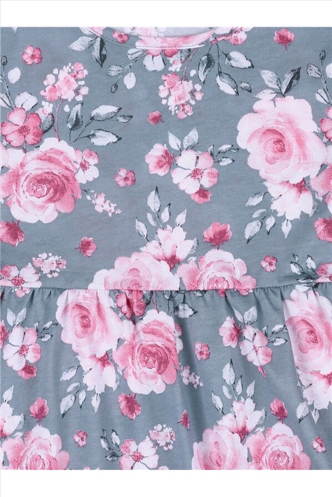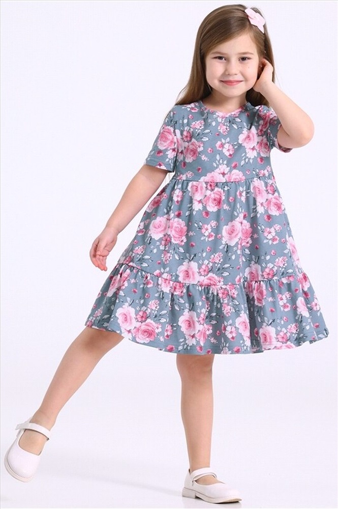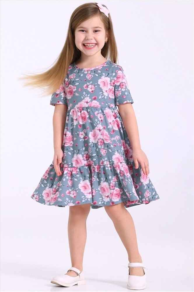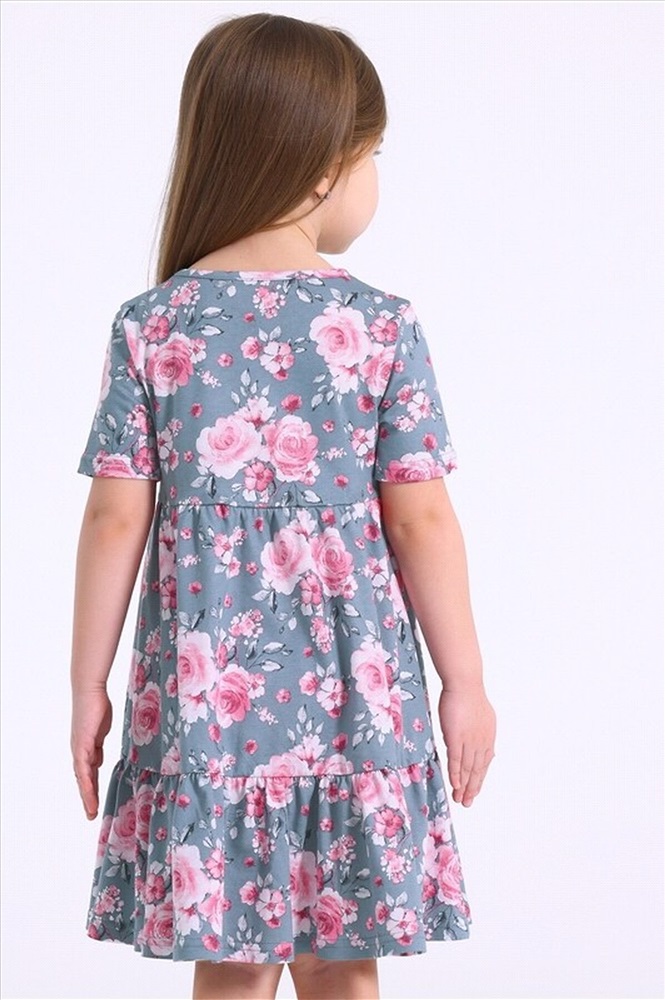 Платье для девочки выполнено из кулира – лёгкого хлопкового полотна. Изделие трапециевидного силуэта, отрезное по талии, с короткими рукавами, юбка украшена широким воланом. Уход: только машинная стирка (руками не стирать!) при температуре 40 градусов, без предварительного замачивания.