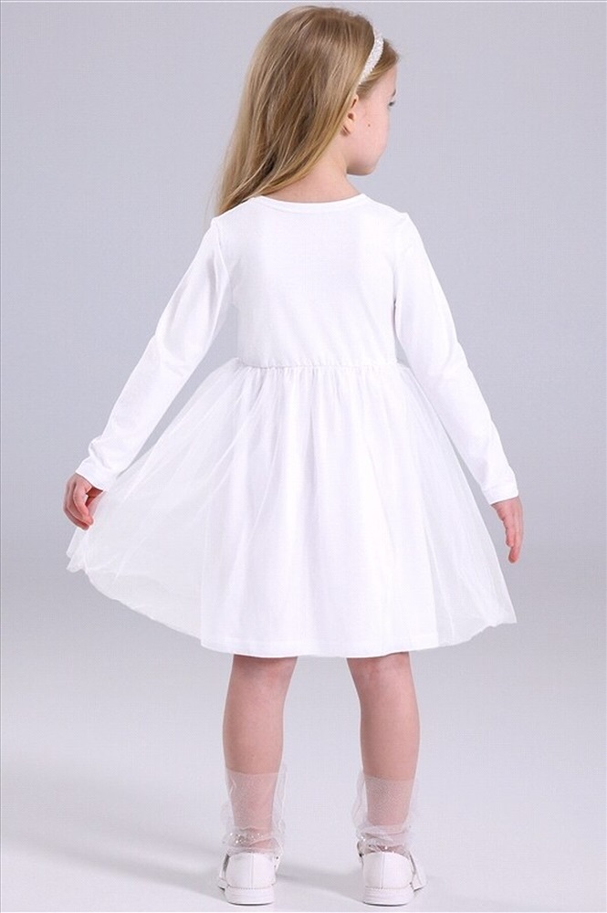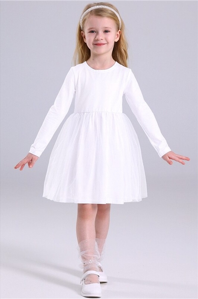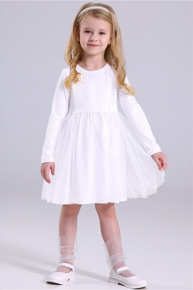 Праздничное платье для девочки выполнено из мягкого хлопкового полотна с лайкрой. Изделие полуприлегающего силуэта, с круглым вырезом горловины и длинными рукавами. Юбка присборена, дополнена двумя слоями мягкой сеточки. Уход: ручная стирка при температуре не более 40 градусов, без предварительного замачивания.