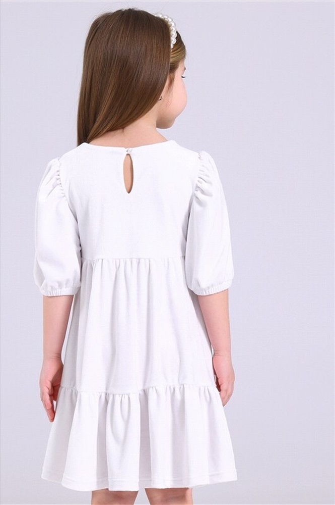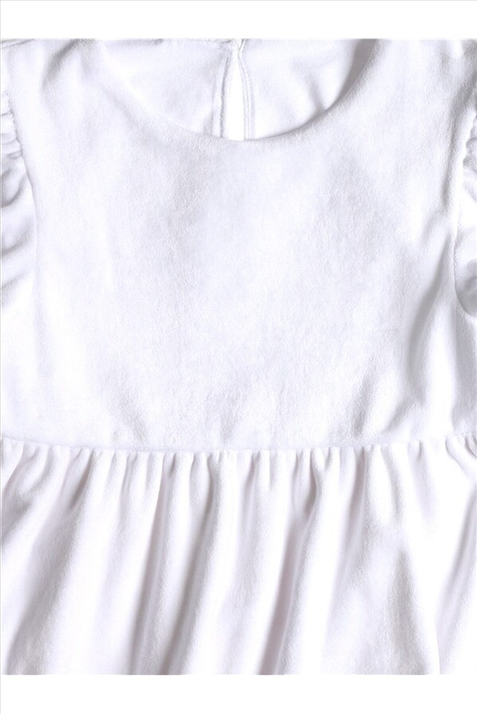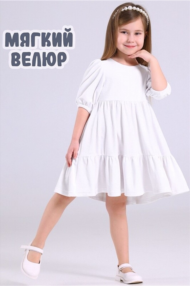 Нарядное платье для девочки выполнено из мягкого велюрового полотна. Изделие трапециевидного силуэта, отрезное по линии талии, полочка и спинка продублированы мягким хлопковым полотном, рукава-фонарики собраны по низу на эластичную тесьму, застежка по спинке на пуговицу, юбка украшена широким воланом. Уход: деликатная машинная стирка (руками не стирать!) при температуре 40 градусов, без предварительного замачивания.