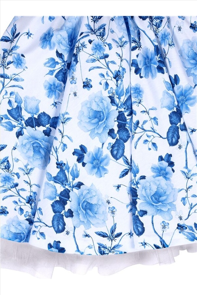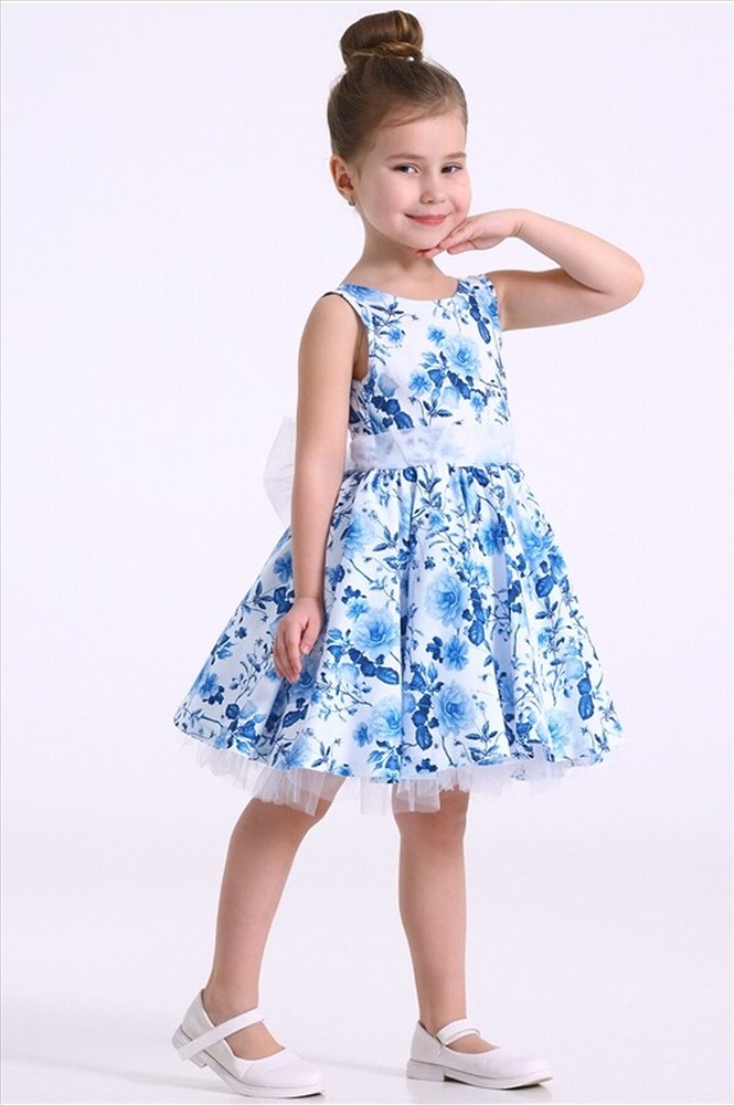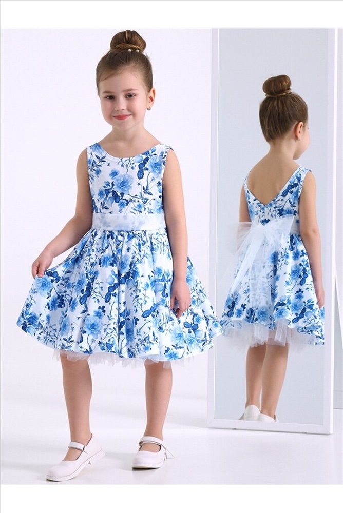 Нарядное платье для девочки из кулира - хлопкового тонкого набивного полотна. Изделие прилегающего силуэта, с V-образным вырезом горловины на спинке и отрезной пышной юбкой. Подъюбник и бант выполнены из сетки. Уход: ручная стирка при температуре не более 40 градусов, без предварительного замачивания.