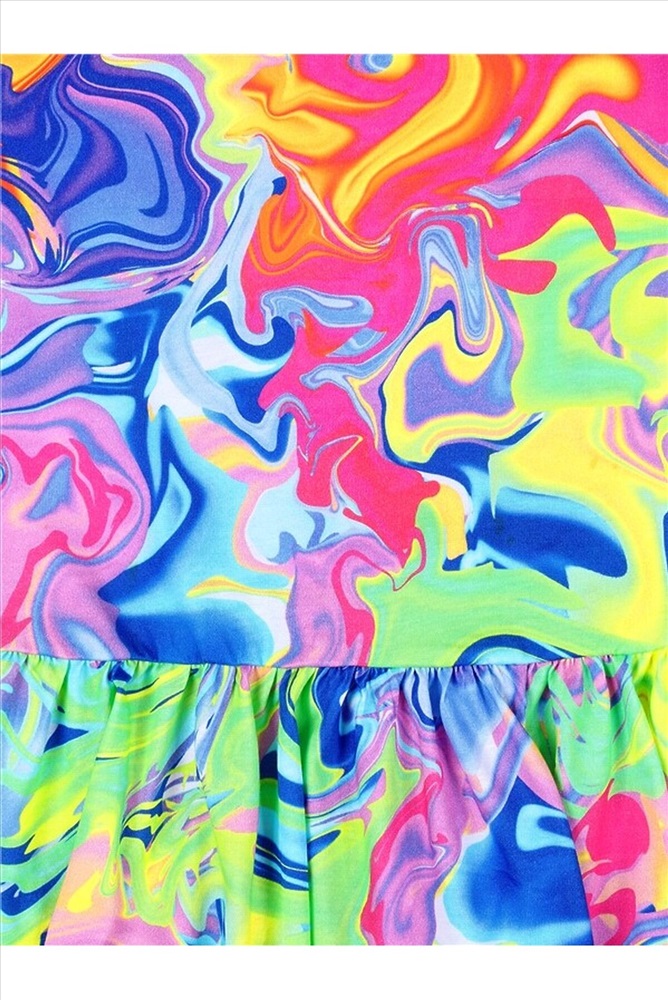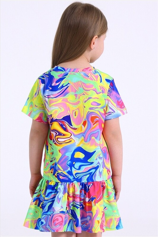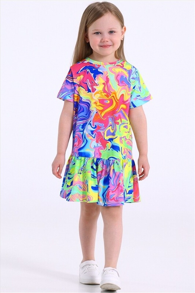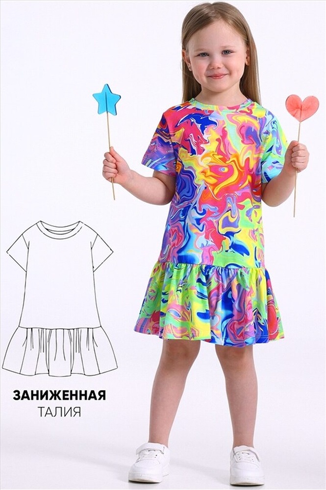 Платье для девочки выполнено из кулира - легкого хлопкового полотна. Изделие трапециевидного силуэта, заниженная линия талии с присборенной юбочкой, короткие рукава со спущенной линией плеча. Уход: только машинная стирка (руками не стирать!) при температуре 40 градусов, без предварительного замачивания.
