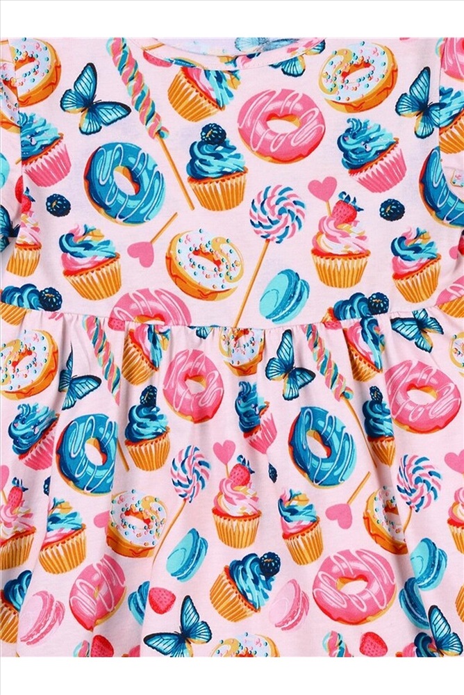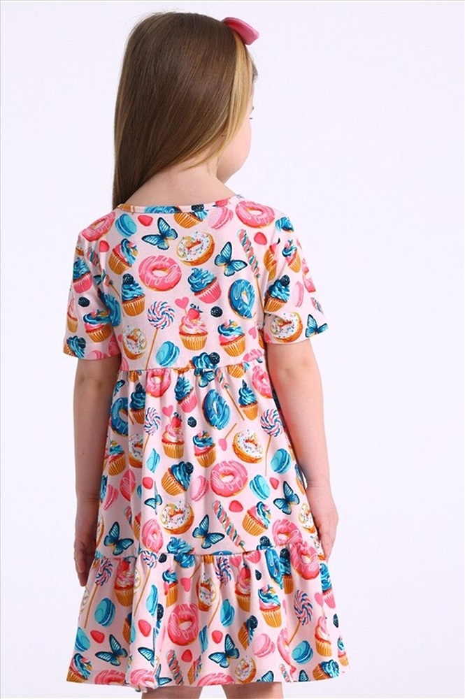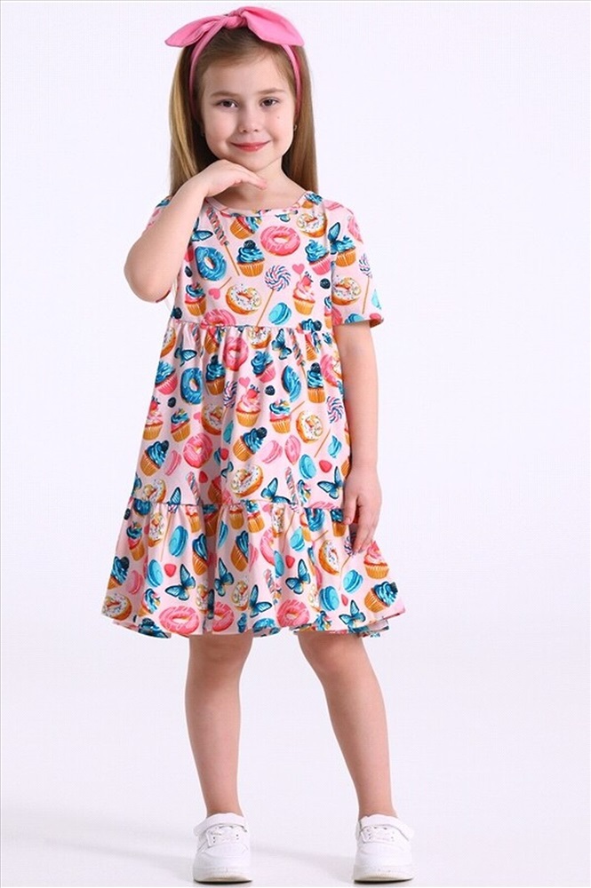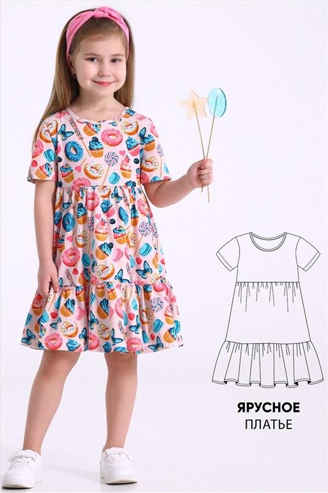 Платье для девочки выполнено из кулира – лёгкого хлопкового полотна. Изделие трапециевидного силуэта, отрезное по талии, с короткими рукавами, юбка украшена широким воланом. Уход: только машинная стирка (руками не стирать!) при температуре 40 градусов, без предварительного замачивания.