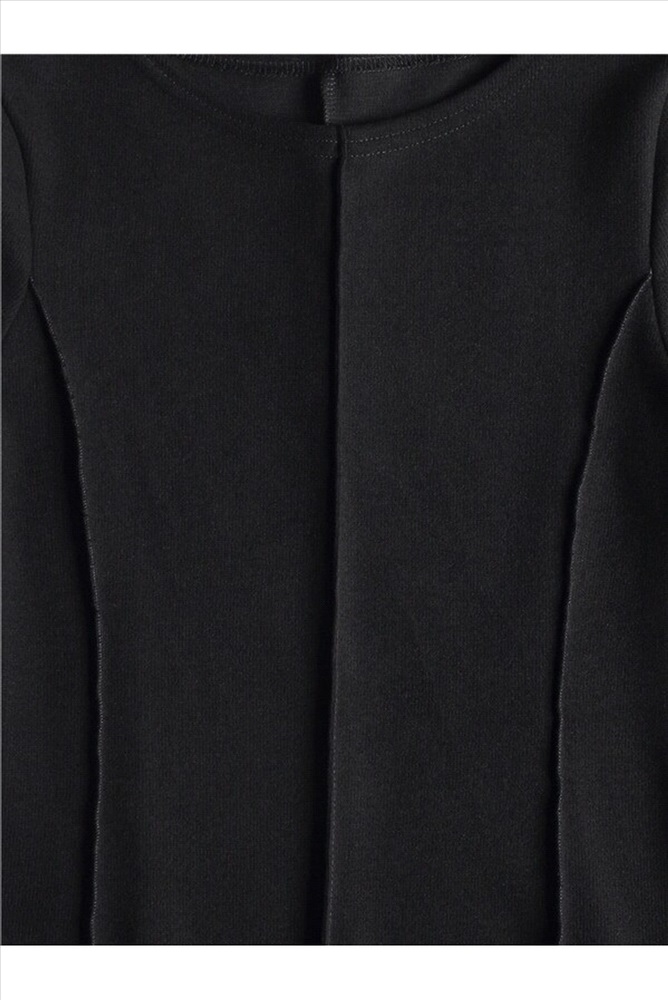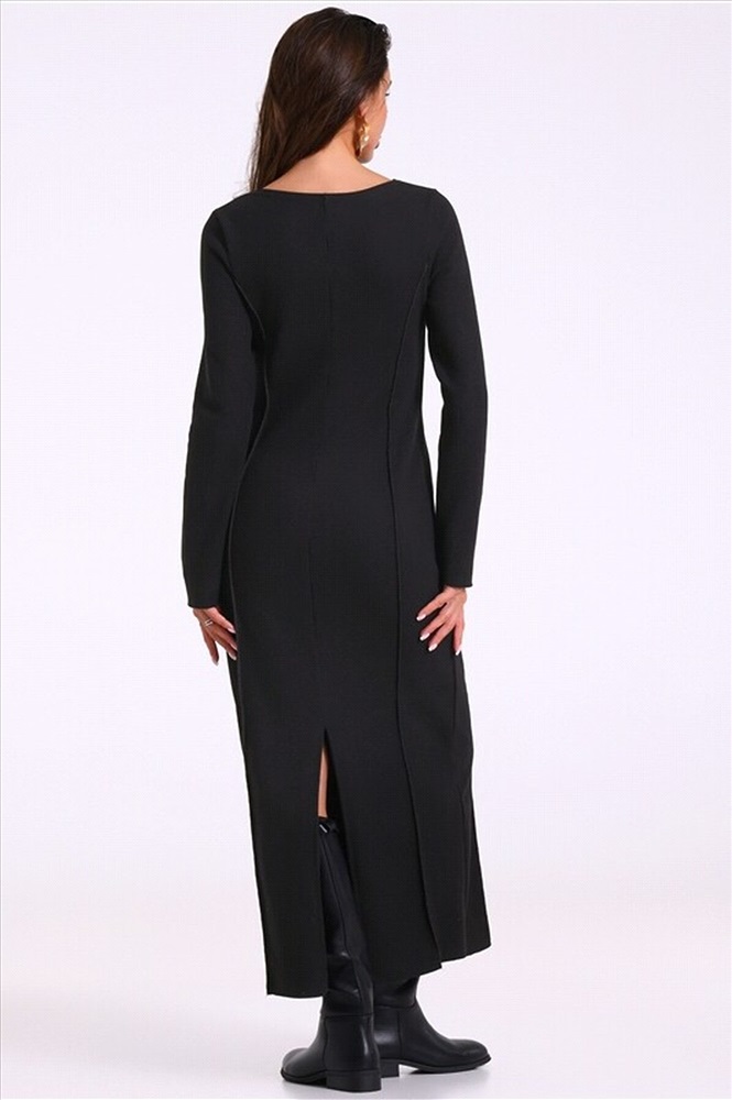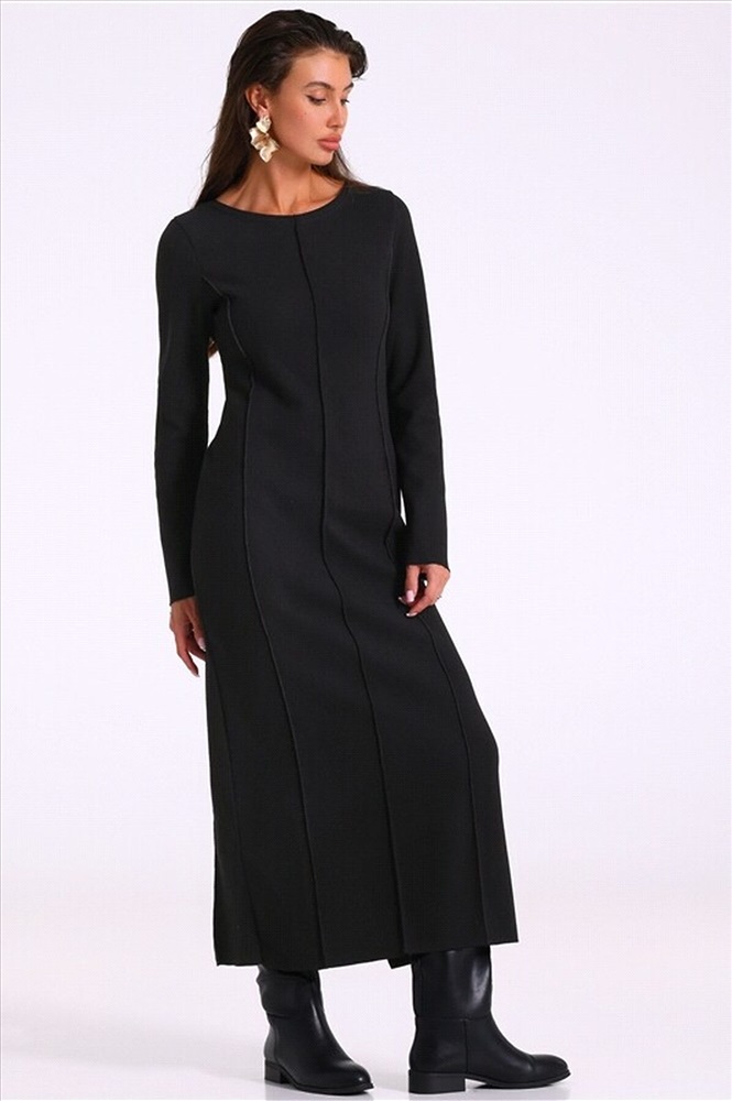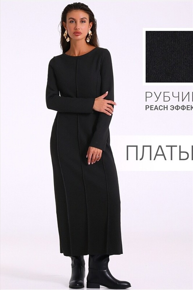 Женское платье выполнено из теплого вязаного полотна в рубчик. Изделие полуприлегающего силуэта с длинными рукавами, с необработанным низом изделия и рукавов. На полочке рельефы из проймы и отстрочка по центру, на спинке средний шов и рельефы из проймы. Уход: только бережная машинная стирка до 40C (руками не стирать), изделие вывернуть наизнанку, без предварительного замачивания. Барабанная сушка запрещена.