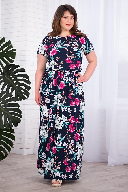 Великолепное платье в пол, чуть присборенное резинкой на линии талии, создает изысканный и грациозный силуэт. Крупные цветы на темно-синем фоне эффектно смотрятся на тонком трикотаже из вискозы. Мягко струящийся, легкий материал с эластичной структурой делает платье особенным. За счет яркого рисунка эта модель с короткими рукавами неизменно привлечет к себе внимание. Идеально подходит для теплых летних дней.