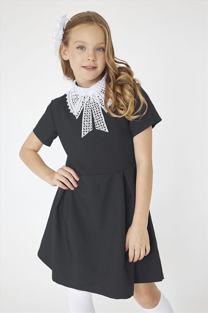 Платье для школы серое со складками на талии. Съемный белый воротник. Застежка на тесьму-молнию, короткие рукава. Стильное удобное платье из вискозы для девочки классического силуэта.