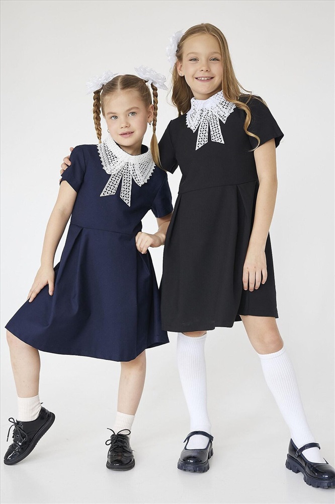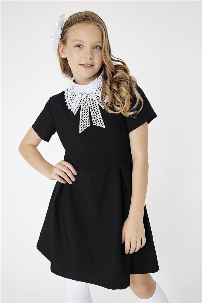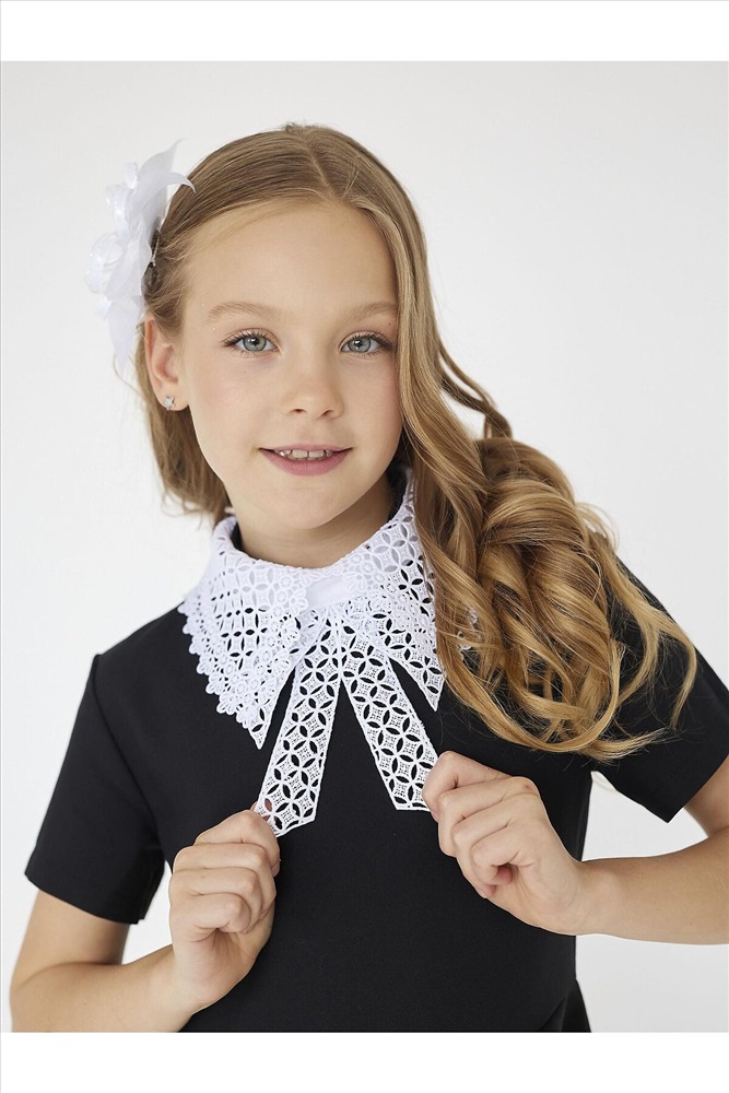 ID товара: 1123951 Состав: Полиэстер 77%, Вискоза 19%, Эластан 4% Сезон: Демисезон Длина: До колена Фасон: Расклешенное Рукав: короткие Вырез горловины: Воротник-стойка Декоративные элементы: Кружево Основная ткань: Полиэстер Стиль: классический Страна бренда: Россия Страна производства: Россия Платье для школы черное со складками на талии. Съемный белый воротник. Застежка на тесьму-молнию, короткие рукава. Стильное удобное платье из вискозы для девочки классического силуэта. Характеристики: