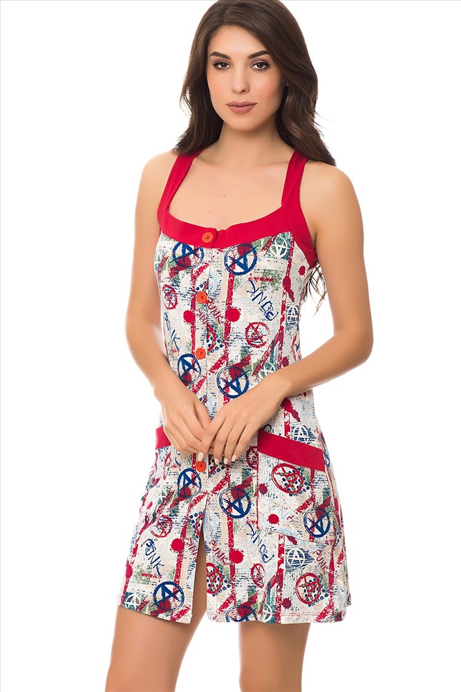 Короткое платье приталенного кроя на лямках с боковыми карманами, с застежкой на пуговицы.