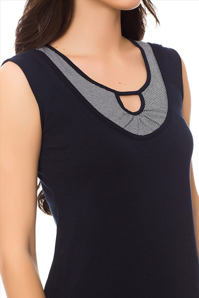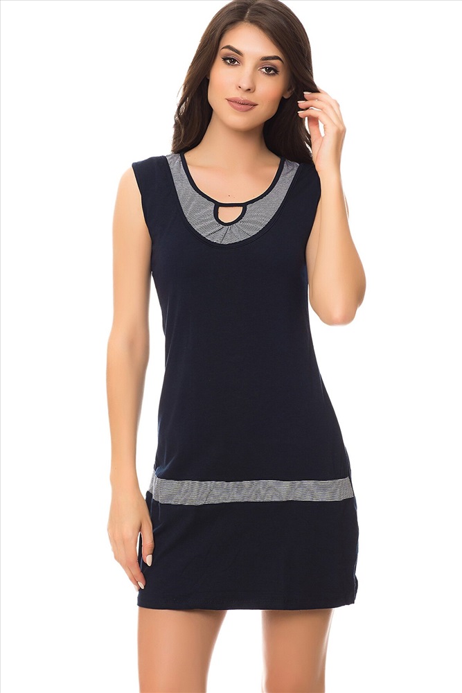 ID товара: 64294 Состав: Хлопок 92%, Эластан 8% Сезон: Весна/Лето Длина: Короткая, 85 см. по спинке Фасон: Приталенный Рукав: Без рукава Вид застежки: Нет Страна бренда: Турция Страна производства: Турция Короткое платье приталенного кроя без рукава, с оригинальной прорезью у выреза горловины. Комментарии к товару
