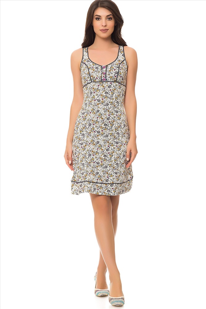 ID товара: 64302 Состав: Хлопок 92%, Эластан 8% Сезон: Весна/Лето Длина: Короткая, 90 см. по спинке Фасон: Приталенный Рукав: Без рукава Вид застежки: Нет Страна бренда: Турция Страна производства: Турция Короткое платье приталенного кроя на лямках, с круглым вырезом горловины с пуговицами. Комментарии к товару