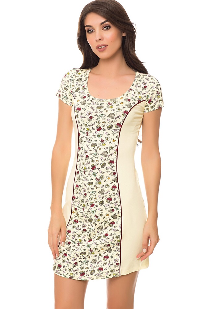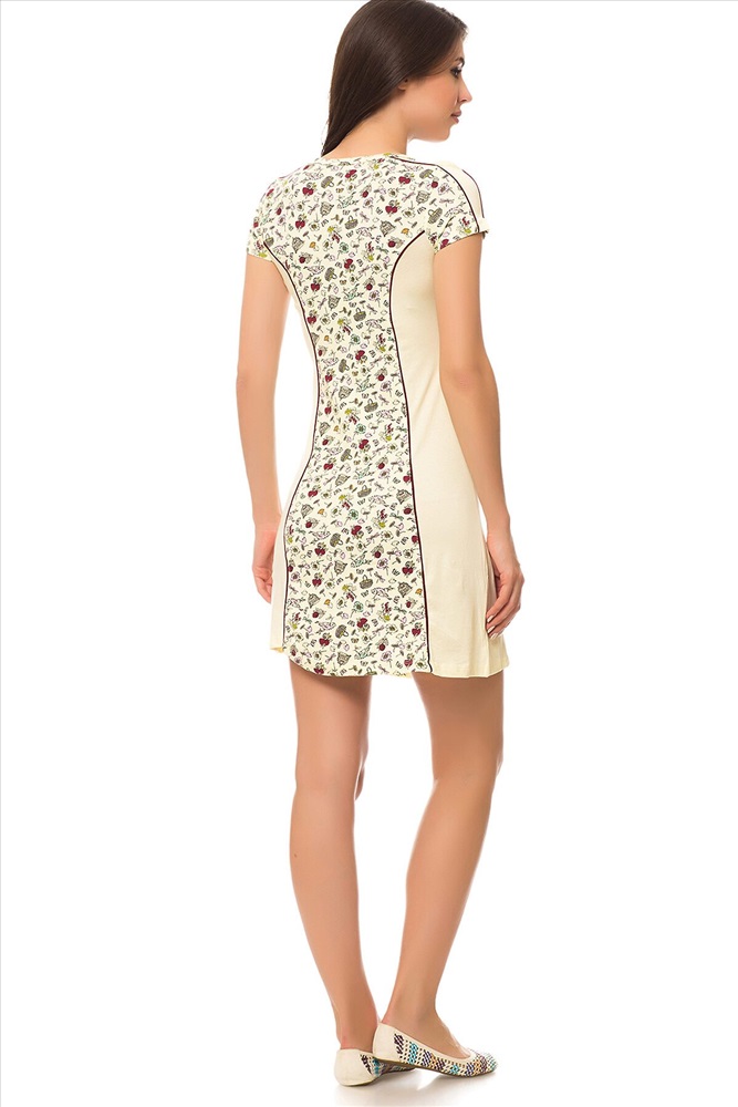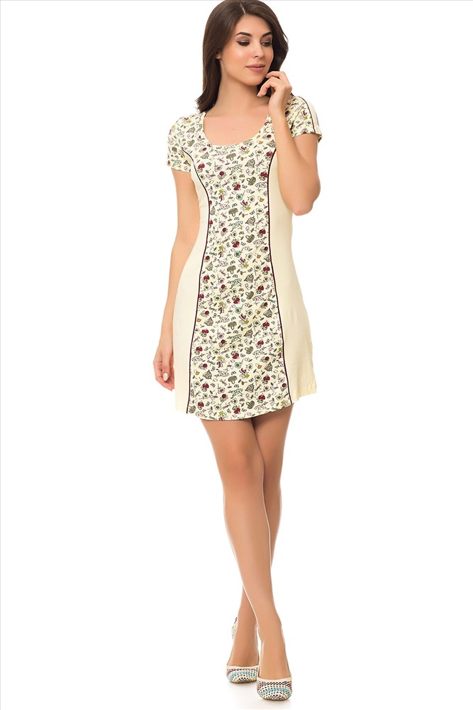 Короткое платье приталенного кроя с миниатюрным рукавчиком и круглым вырезом горловины.
