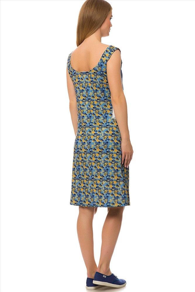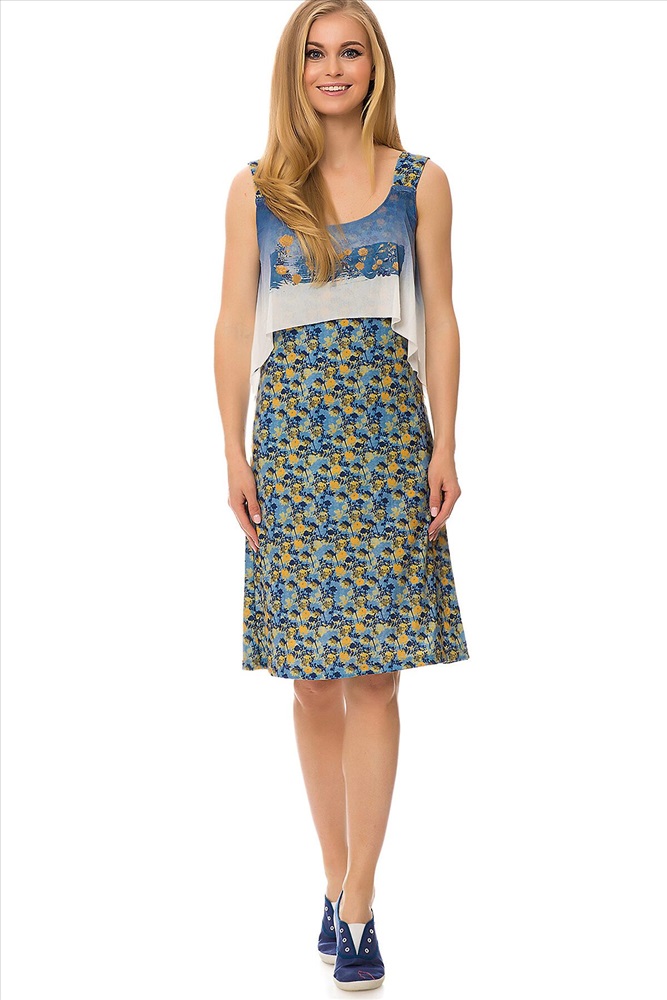 Платье приталенного кроя без рукава с цветочным принтом и оригинальным двойным лифом.