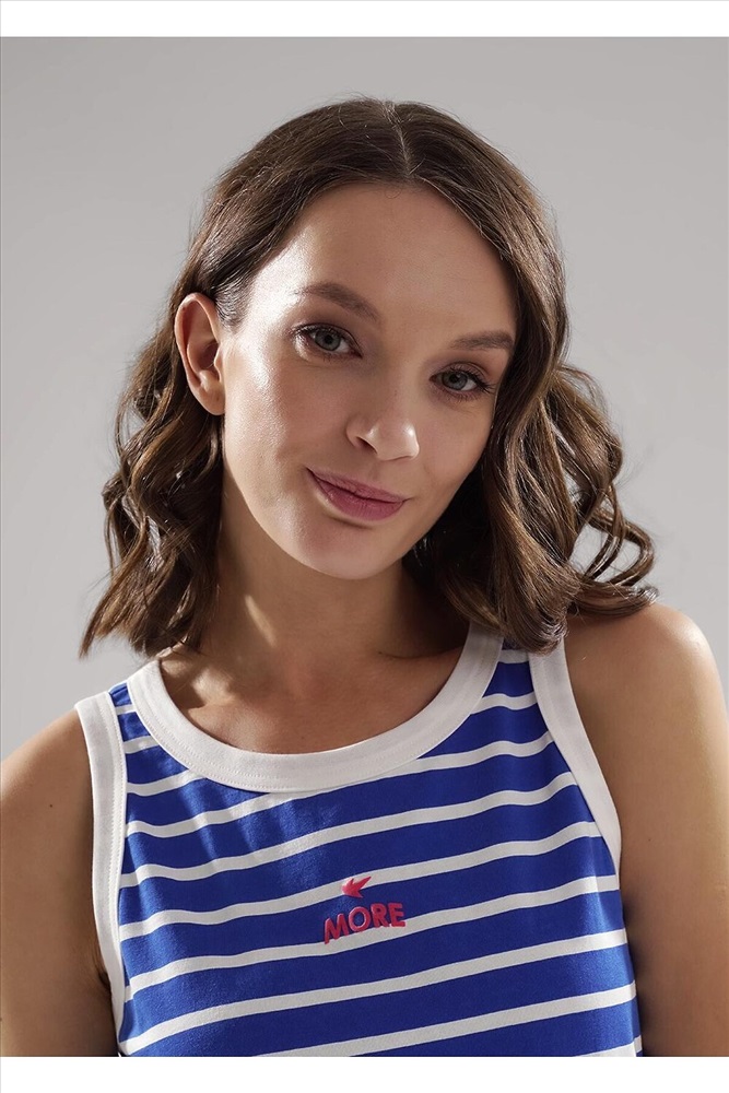 Платье для дома и отдыха прямого силуэта из хлопкового трикотажного полотна, без рукавов среднее плечо. По горловине и пройме окантовка. Спереди принт вспенка, боковые разрезы.