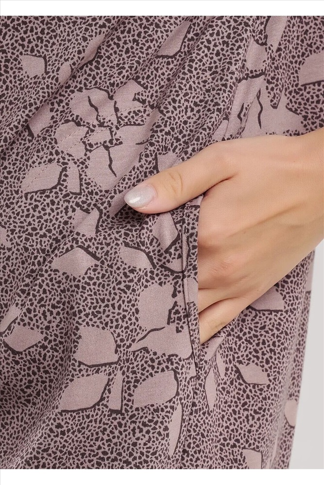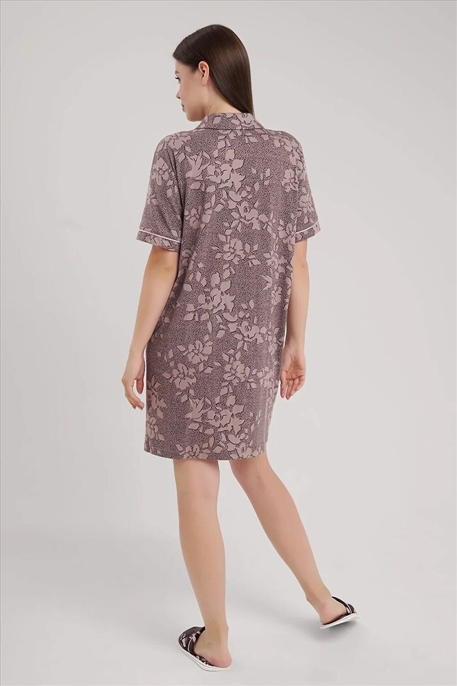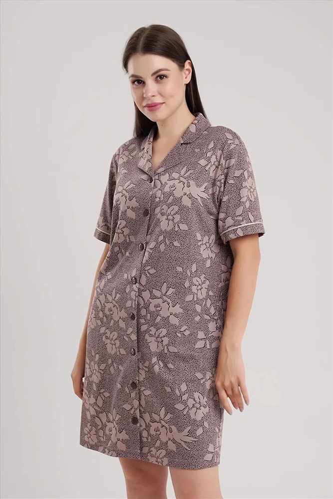 Платье для дома и отдыха из трикотажного полотна с добавлением модала, прямого силуэта с застежкой на пуговицы. Втачной короткий рукав, по низу рукава манжет с кантом. По горловине воротник с лацканами. Боковые карманы с окантовкой.