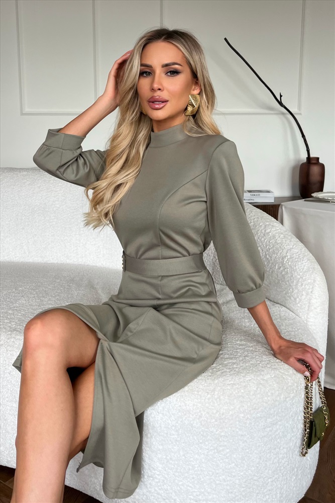 Платье полуприлегающего силуэта изготовлено из трикотажного полотна. Горловина оформлена воротником-стойка, по среднему шву спинки застежка на потайную молнию. Втачной рукав длиной 7/8 присобран на монжету. Модель отрезная по линии талии дополнена поясом с застежкой на петли и пуговицы. Низ ровный, по переду шлица.