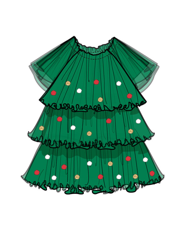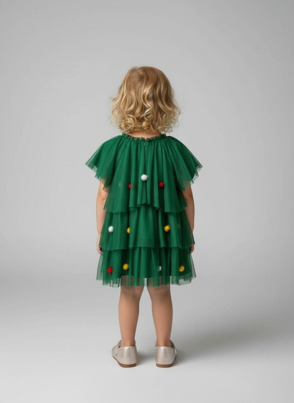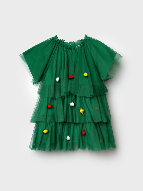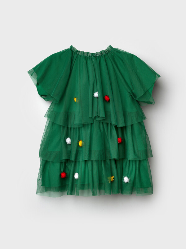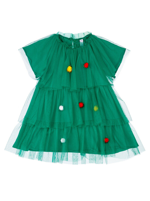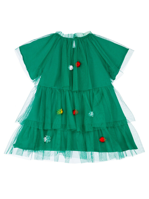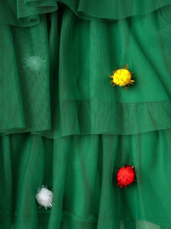 Платье карнавальное - ёлочка. Подкладка из трикотажа с высоким содержанием хлопка 95%. Благодаря наличию эластана в составе ткани, изделие держит форму и меньше мнется. Без застежек. Сверху мягкая сетка, декорированная разноцветными помпонами.