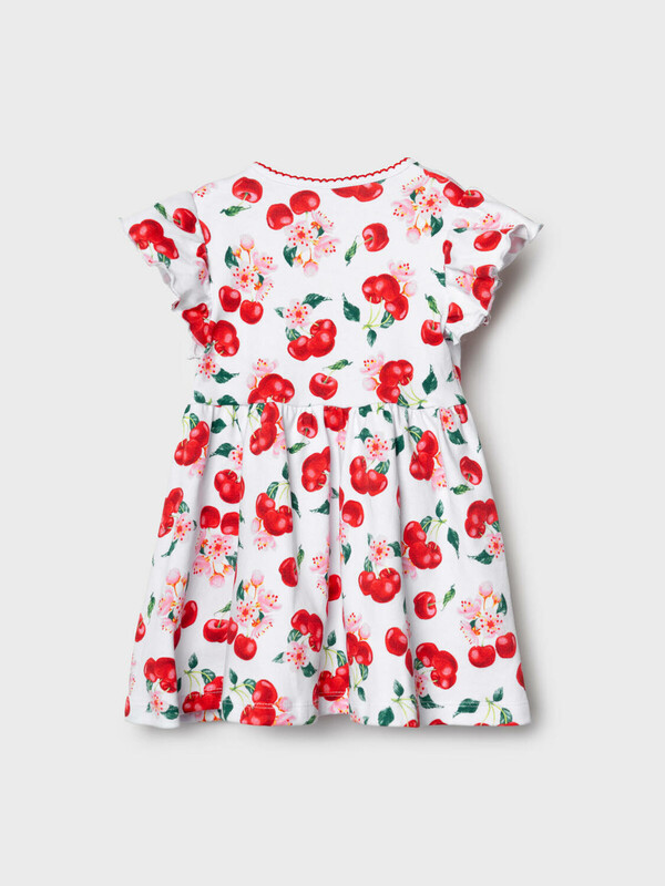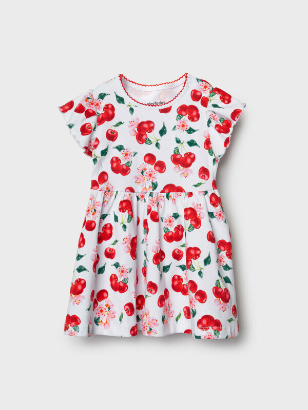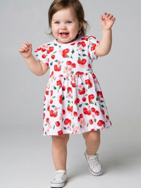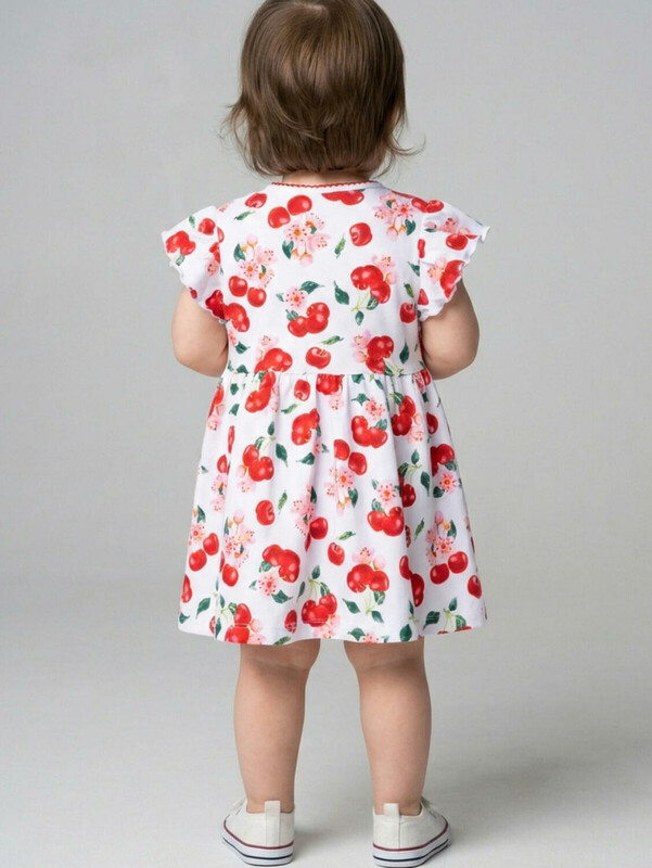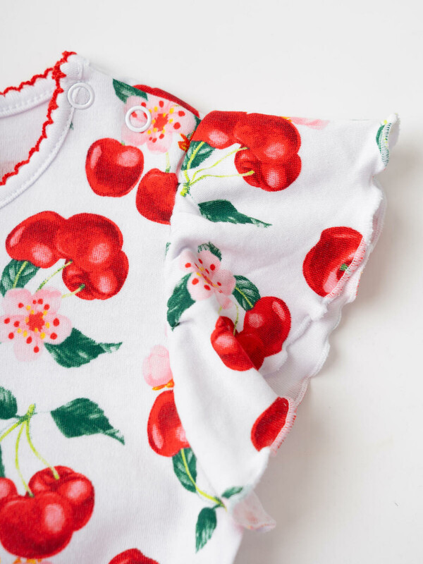 Лёгкое детское платье для девочки. Модель имеет свободный крой и среднюю длину — до колена. Платье выполнено из мягкого хлопкового трикотажа интерлок. Рукава в форме воланов добавляют образу воздушности, а принт с вишнями и цветками делает изделие особенно милым. Для удобства надевания на левом плече расположены кнопки.