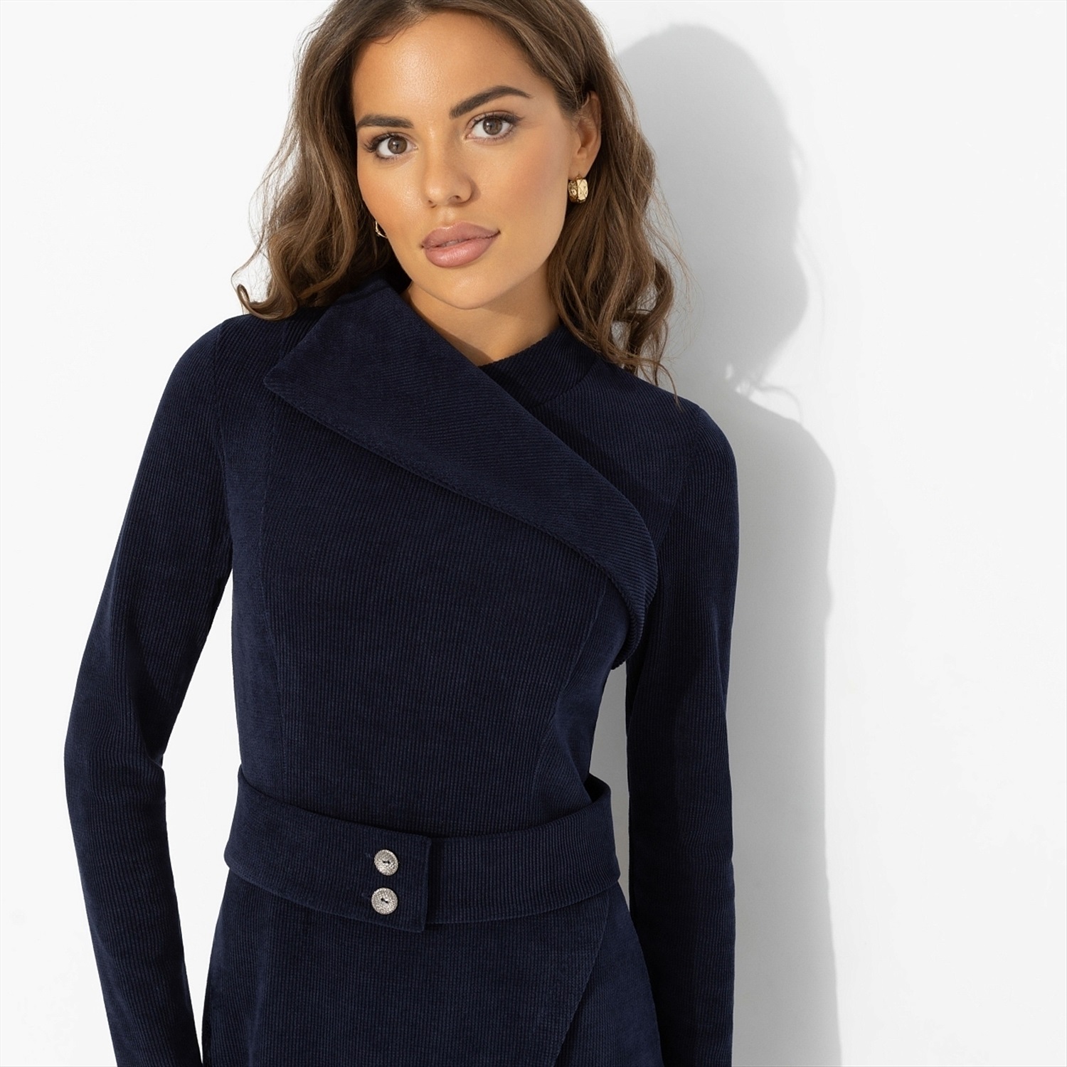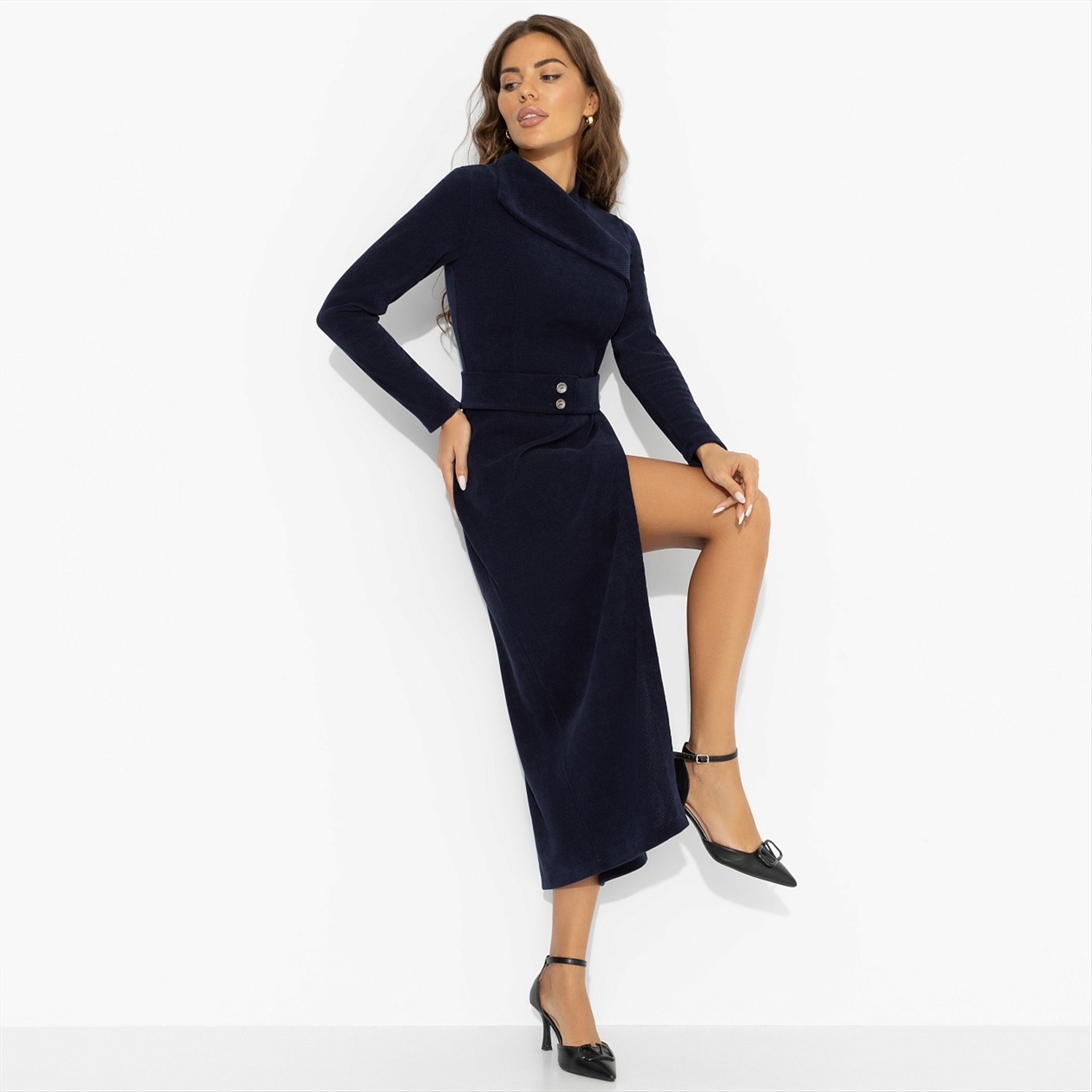 Платье для тех, кто выбирает лучшее без лишних слов. Сдержанная роскошь, спокойная уверенность... и любовь уже откликается на внутреннюю аристократию. Асимметричная верхняя деталь и аккуратный пояс с пуговицами добавляют к строгой эстетике лёгкий намёк на интригу – как будто за идеальной формой скрывается своя маленькая тайна. Конечно, разгадать ее сможет только «тот самый». Платье из плотного, моделирующего фигуру вельвета на трикотажной основе.