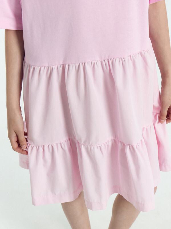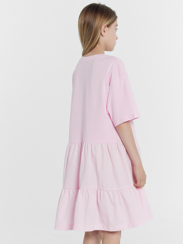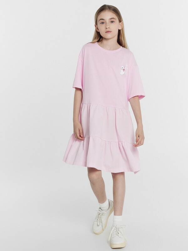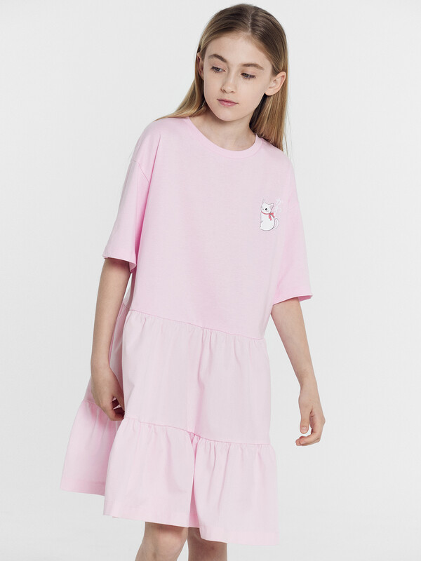 Многоярусное платье силуэта оверсайз для девочек. Вырез классический – круглый, не глубокий. Спущенная линия плеча дарит особый комфорт. Рукава короткие, подогнуты. Нижние ярусы платья выполнены из поплина. Рекомендуем!