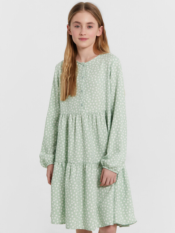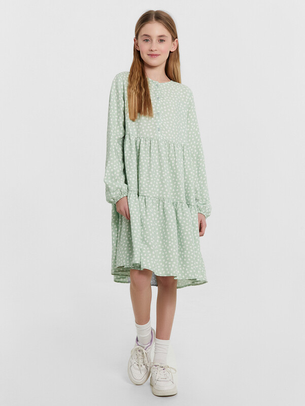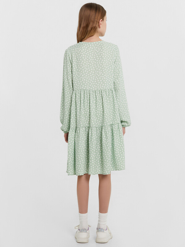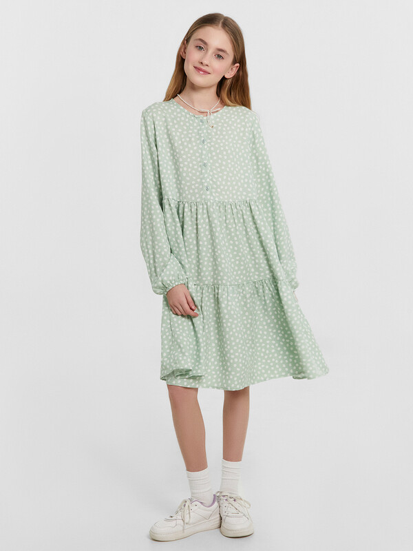 Производитель: Mark Formelle Красивое детское платье для девочек в классическом А-силуэте с отрезными воланами. Эта модель из 100% вискозы сочетает в себе изящество и шарм, создавая идеальную гармонию стиля. По переду платья расположена застежка-планка, состоящая из четырех элегантных пуговиц. Горловина платья выполнена в форме круглого выреза. Длинные втачные рукава придают платью элегантность и изысканность. Такое платье станет идеальным выбором на каждый день и для праздников. Оно подчеркнет индивидуальность вашей девочки, а его оригинальный дизайн не оставит равнодушными окружающих. Рекомендуем!