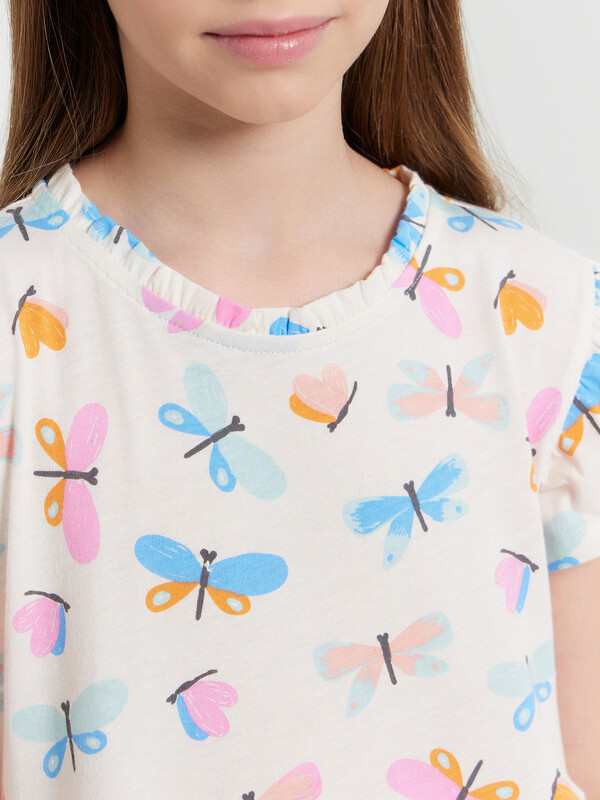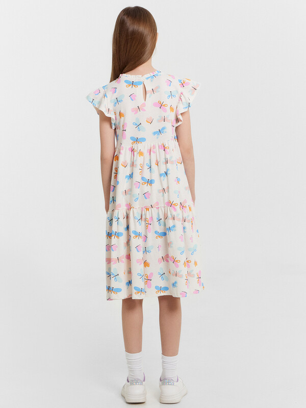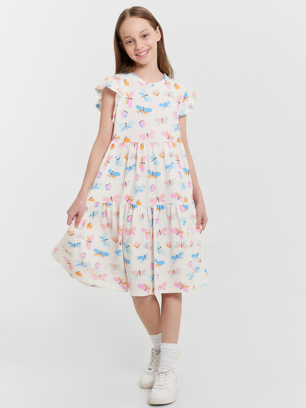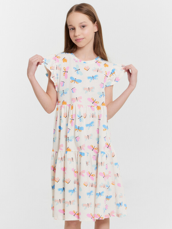 Производитель: Mark Formelle Платье А-силуэта. Короткие рукава-крылышки. В круглую горловину втачана декоративная рюша. По спинке застежка на пуговицу. Платье с двумя отрезными воланами по переду и спинке. Низ изделия обработан швом в подгибку на 2-х игольной плоскошовной машине.