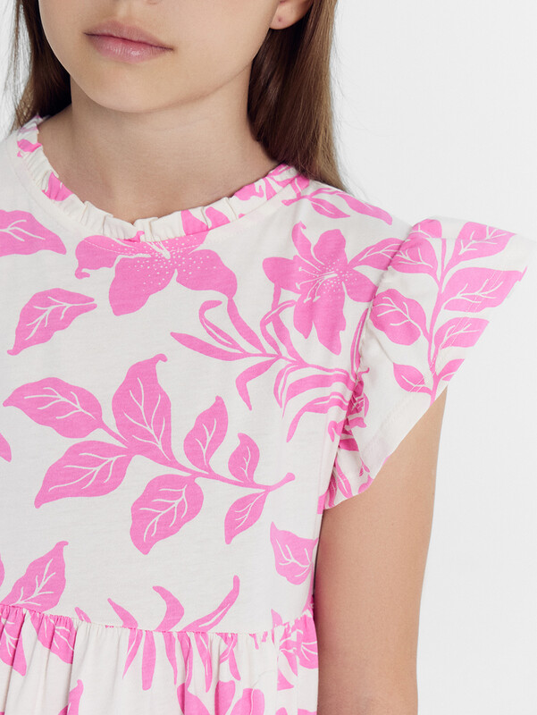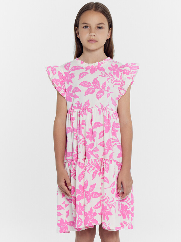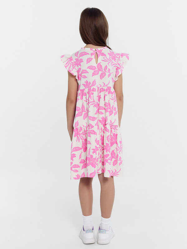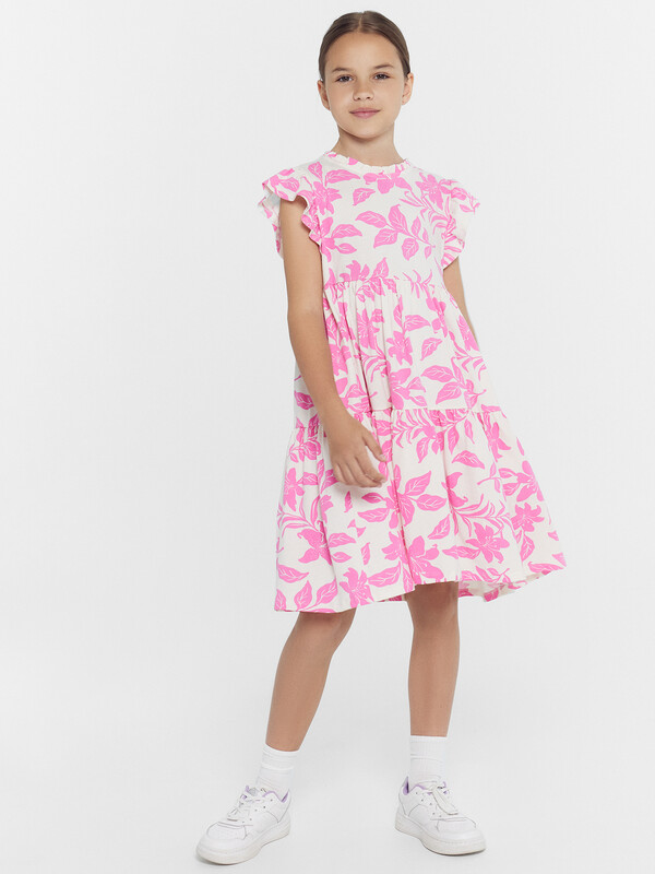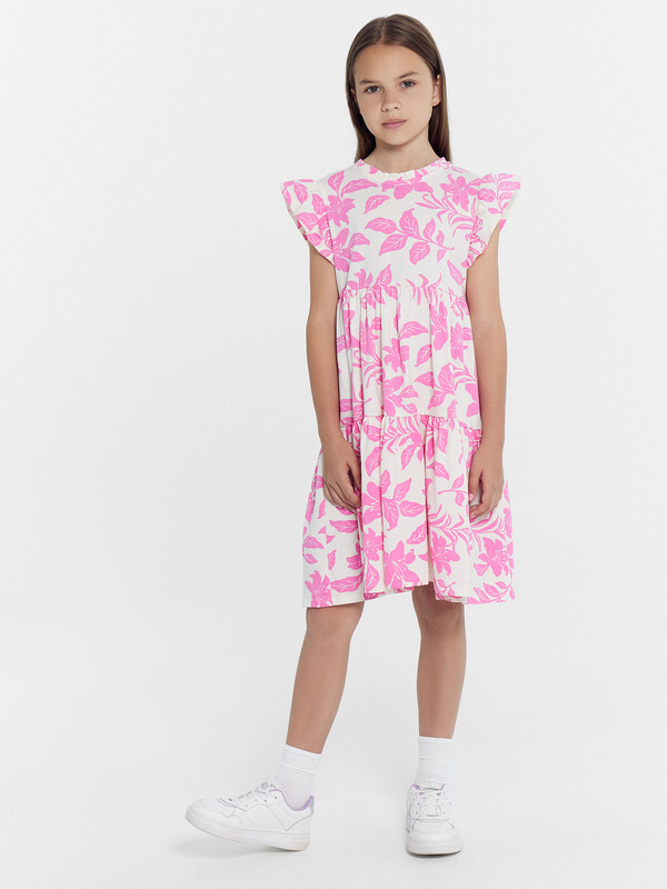 Платье А-силуэта. Короткие рукава-крылышки. В круглую горловину втачана декоративная рюша. По спинке застежка на пуговицу. Платье с двумя отрезными воланами по переду и спинке. Низ изделия обработан швом в подгибку на 2-х игольной плоскошовной машине.