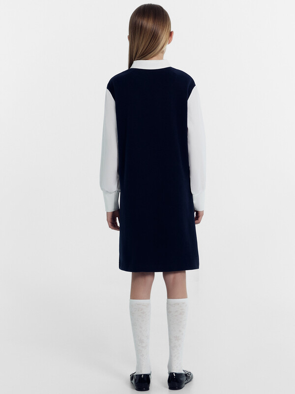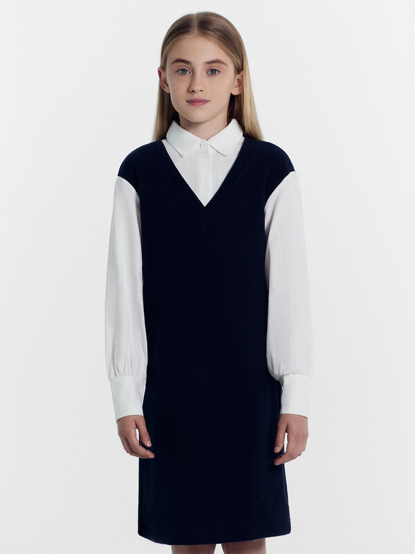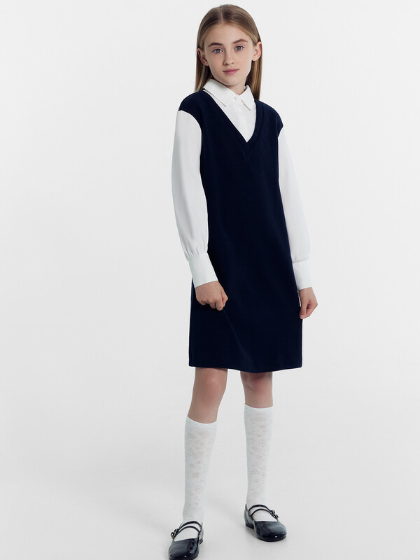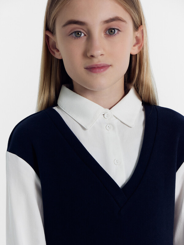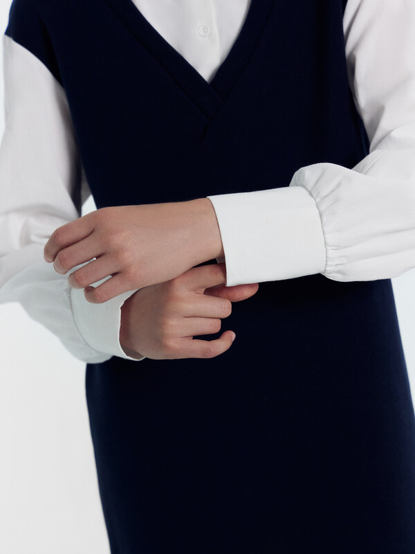 Селаник. Платье свободного силуэта, с имитацией жилетки и рубашки. Жилет-платье из селаника горловина V-образной формы. Рубашка из ткани горловина круглой формы, воротник с цельнокроенной стойкой. По переду центральная застежка на пуговицы. Плечо спущено, пройма углубленна. Рукава втачные, длинные из ткани. Низ рукава немного расширен и присборен, по низу рукава отрезная манжета из ткани. Платье длиной выше колена.