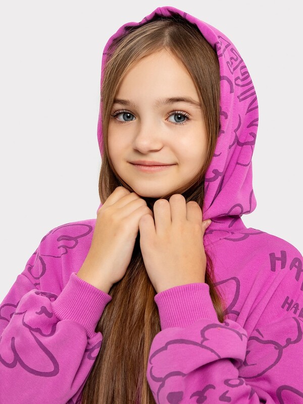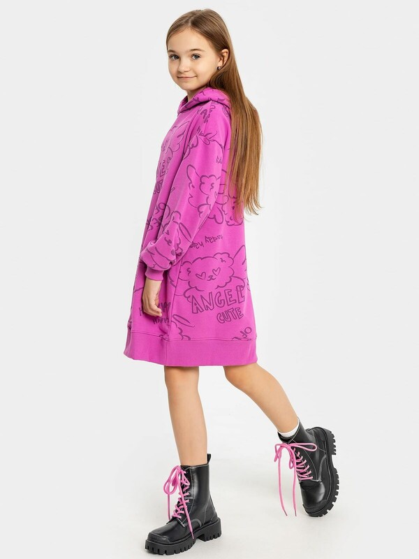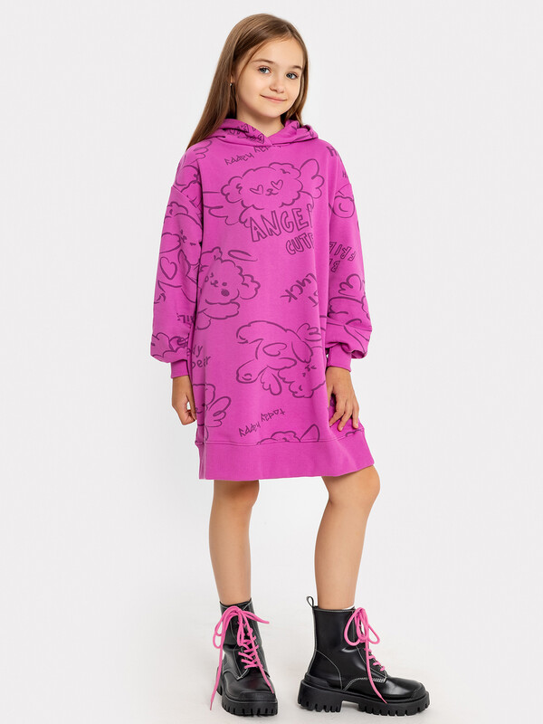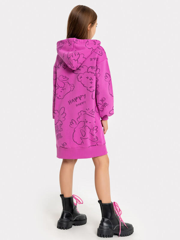 Платье свободного силуэта с капюшоном. Рукава длинные, втачные. Линия плеча спущена. Перед и спинка цельнокроенные. Горловина круглой формы. Подкладка капюшона из основного полотна. По низу рукавов и изделия притачены манжеты и пояс из рибаны.