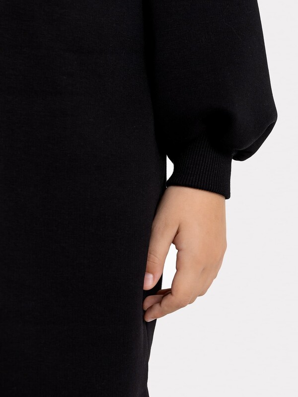 Платье свободного силуэта. Горловина круглой формы обработана обтачкой из рибаны. Шов притачивания рибаны распошит. Рукава длинные, втачные, внизу на сборке. Линия плеча спущена. По низу рукавов притачные манжеты из рибаны. Центральный шов по спинке с разрезом снизу. Низ изделия обработан на 2-х игольной плоскошовной машине швом в подгибку. Длина платья выше колена.