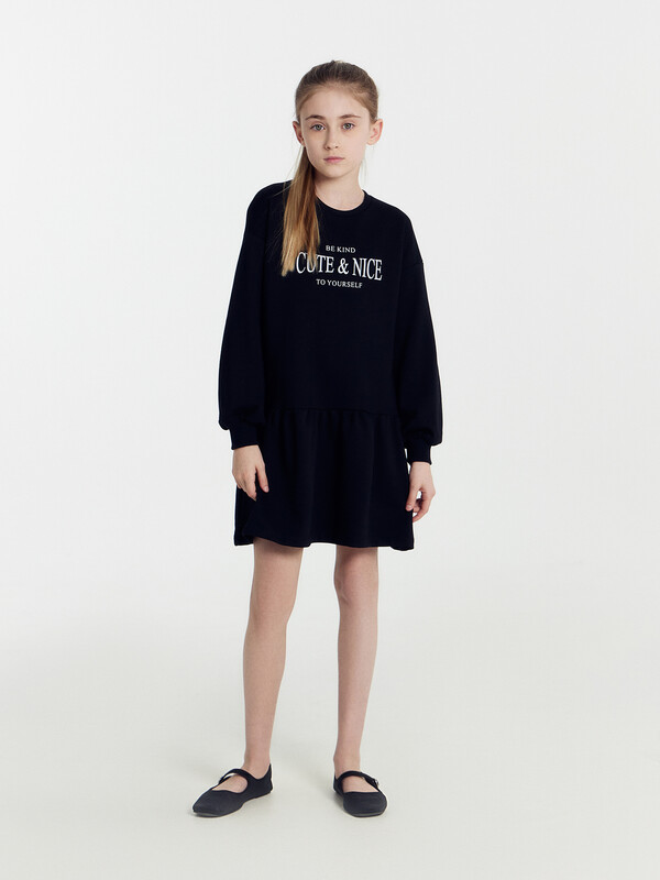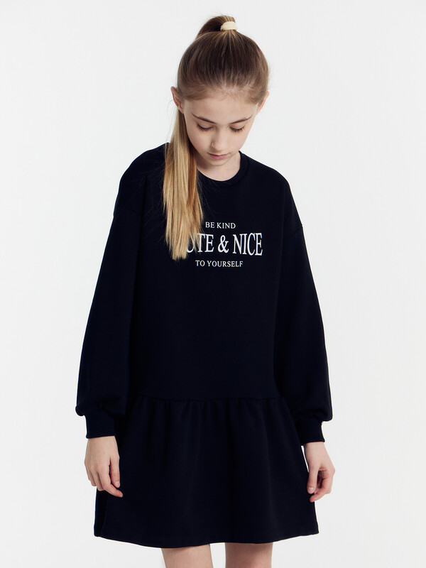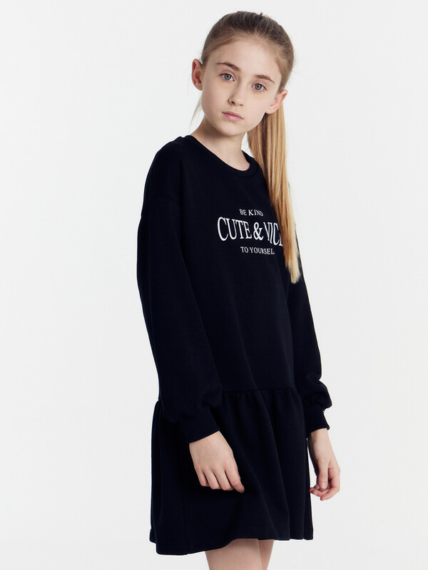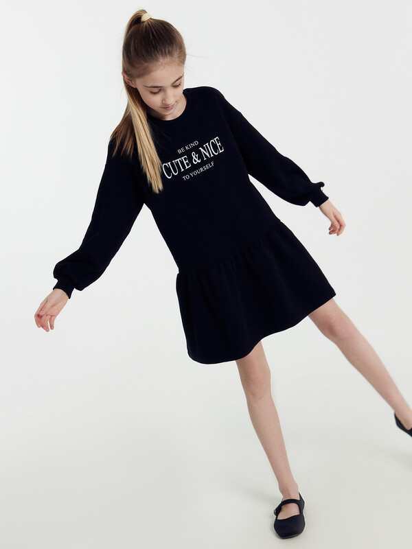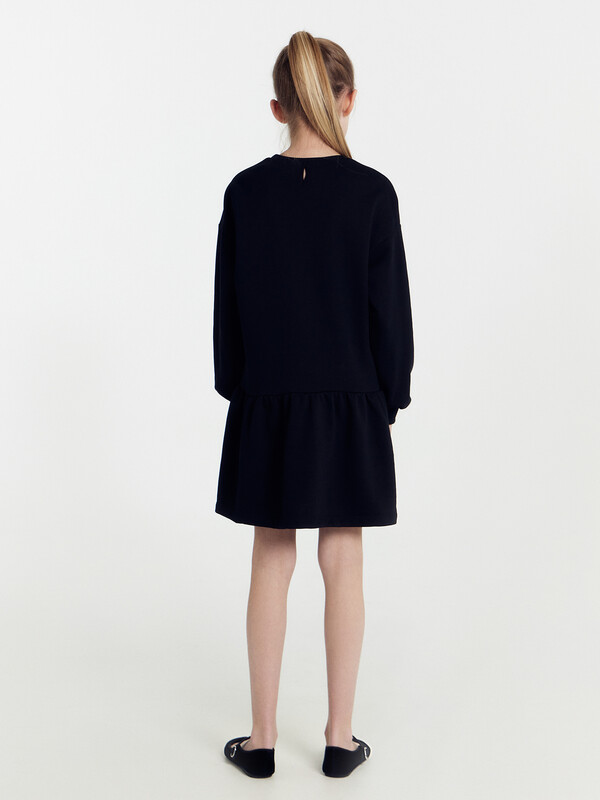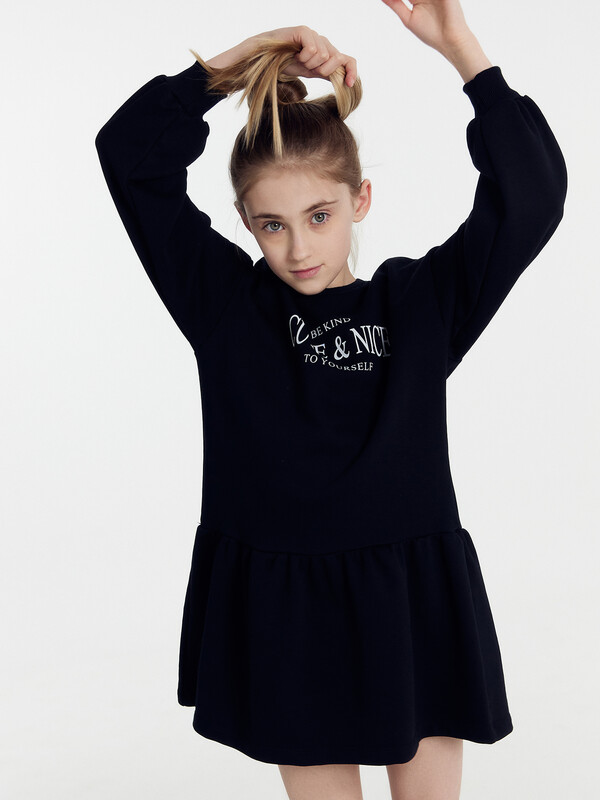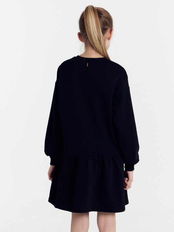 Платье прямого силуэта, с отрезным воланом по низу. Рукава длинные, втачные. Линия плечаспущена. По низу рукавов притачные манжеты из рибаны. В круглую горловину втачан воротникиз ткани с рюшей. По спинке застёжка-капелька на пуговице. Низ изделия обработан швомв подгибку на 2-х игольной плоскошовной машине.