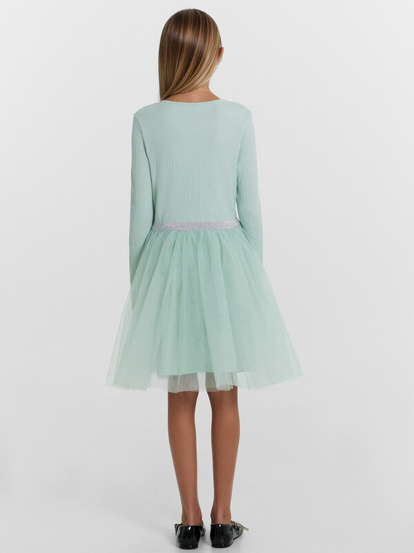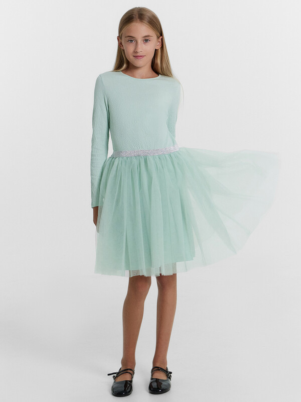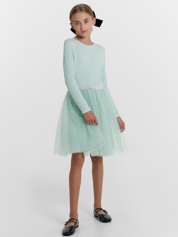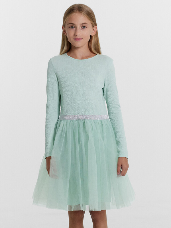 Производитель: Mark Formelle Платье полуприлегающего силуэта  с отрезной юбкой. Длина выше колена. Горловина круглая, окантована бейкой из основного полотна. Рукав втачной длинный. Низ рукава обработан на 2-х игольной плоскошовной машине. Юбка трехслойная на сборке. Верхние два слоя из трикотажного полотна сетки, подкладка из трикотажного кулирного полотна. Пояс из жаккардовой тесьмы