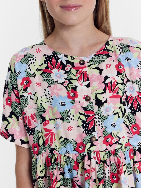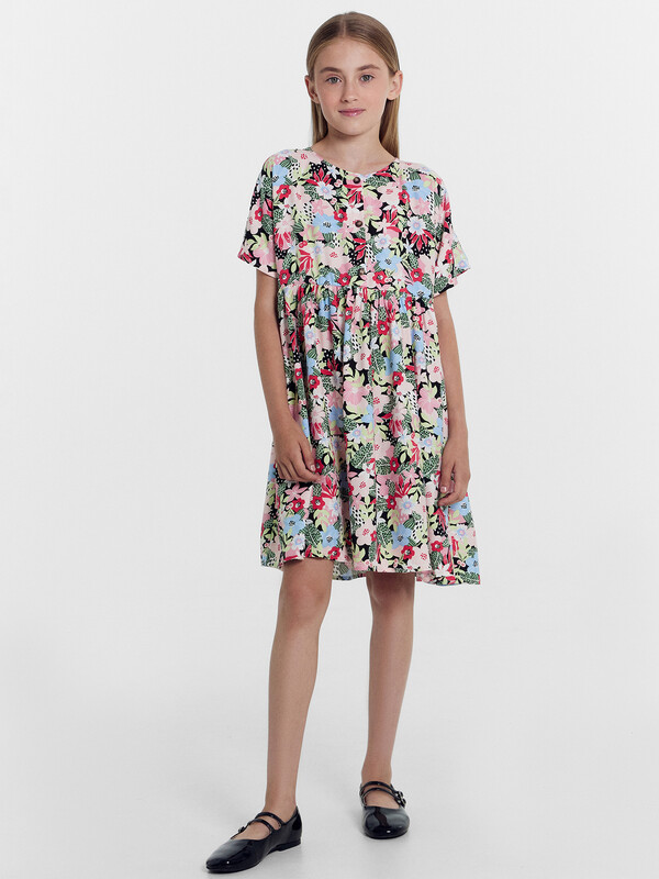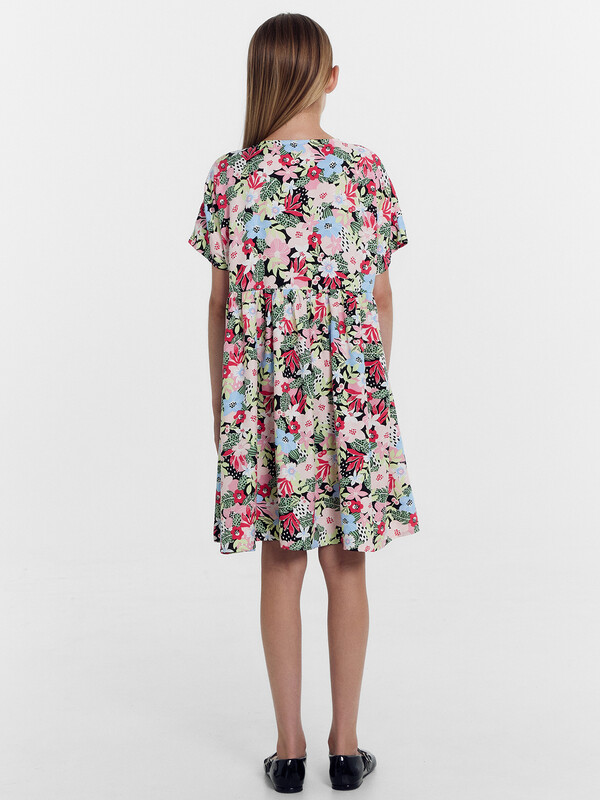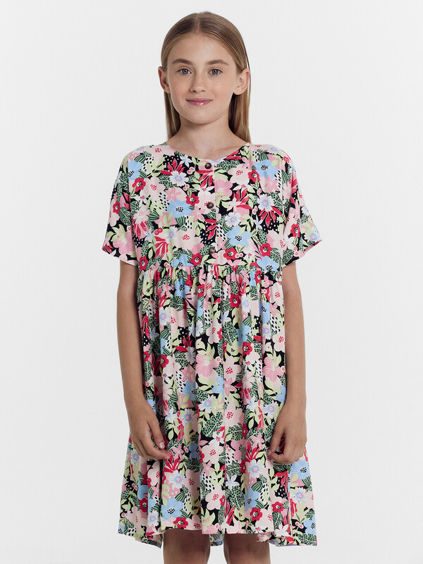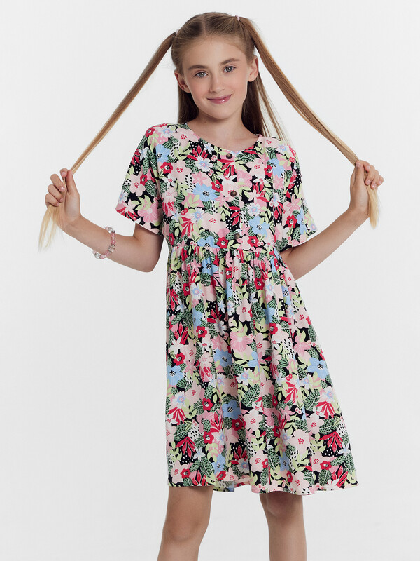 Платье прямого силуэта с цельнокроеным рукавом. Горловина круглая, обработана бейкой из основного полотна в чистый край. Платье отрезное по талии, нижняя часть платья присборена. Перед с центральной застежкой на пуговицы. Низ изделия и рукавов обработаны швом в подгибку.