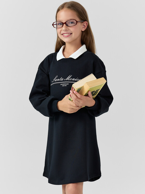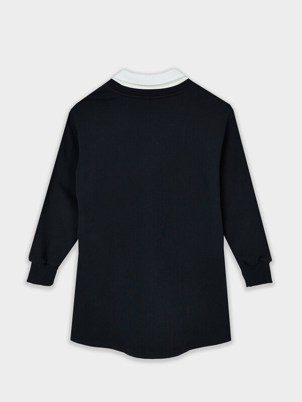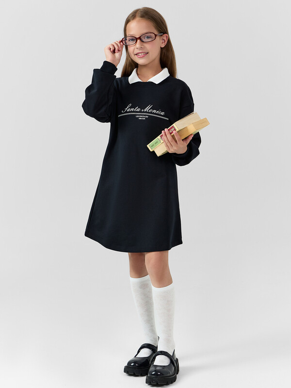Платье свободного силуэта. Перед и спинка цельнокроеные. Горловина круглой формы c окантовкой из трикотажного полотна рибаны. В горловину втачан вязаный воротник, шов втачивания закрыт х/б тесьмой. Рукава длинные, втачные. Линия плеча спущена. По низу рукавов притачные манжеты из трикотажного полотна рибаны. Низ изделия фигурный, обработан на 2-х игольной