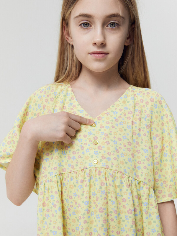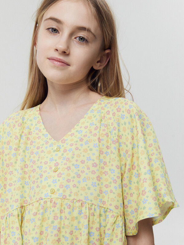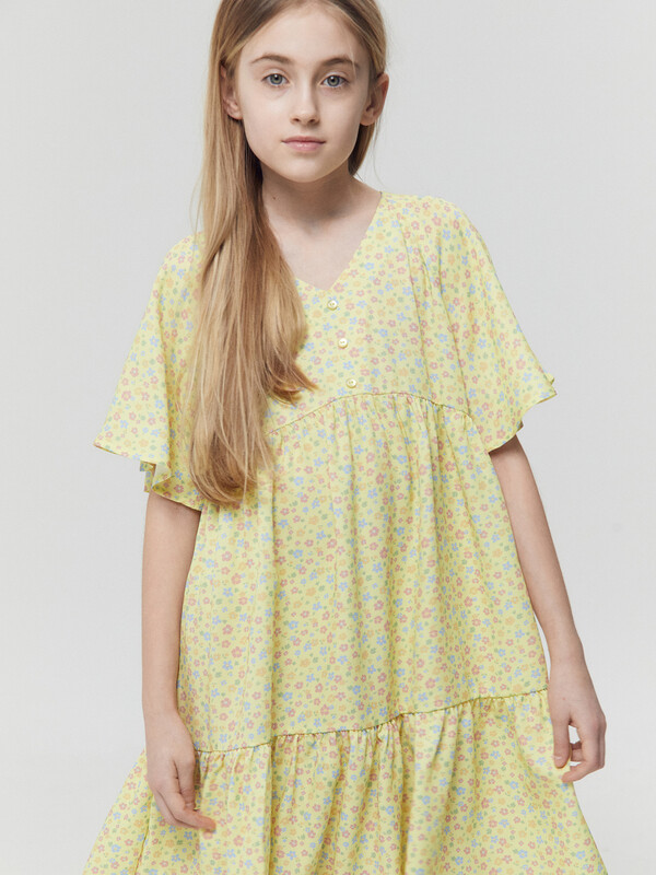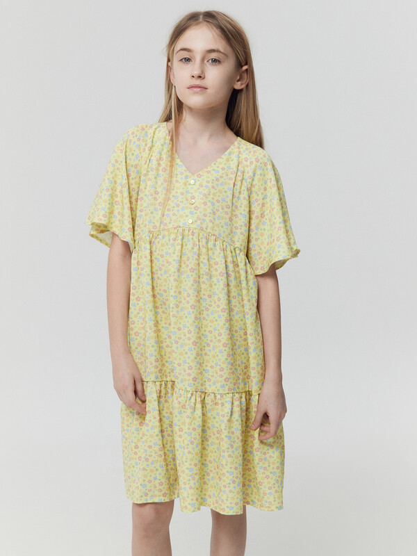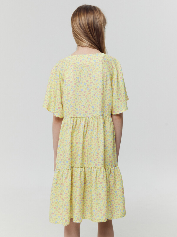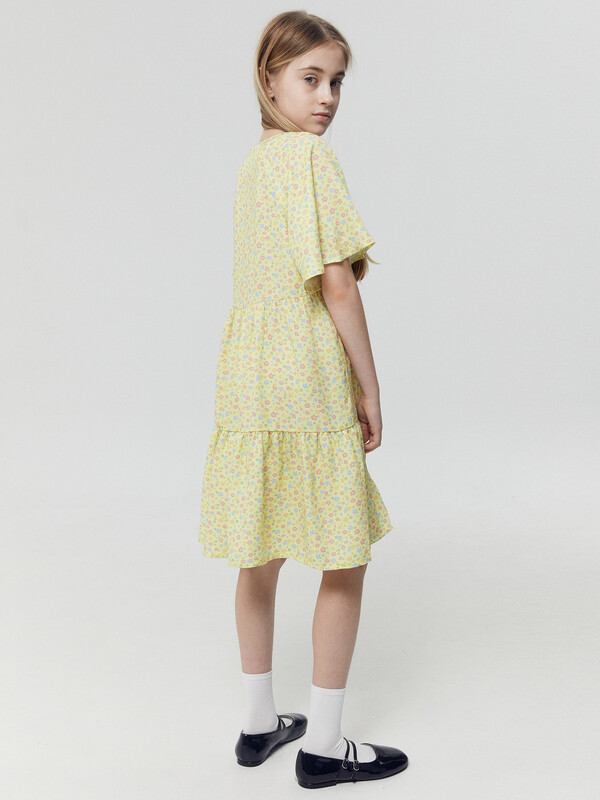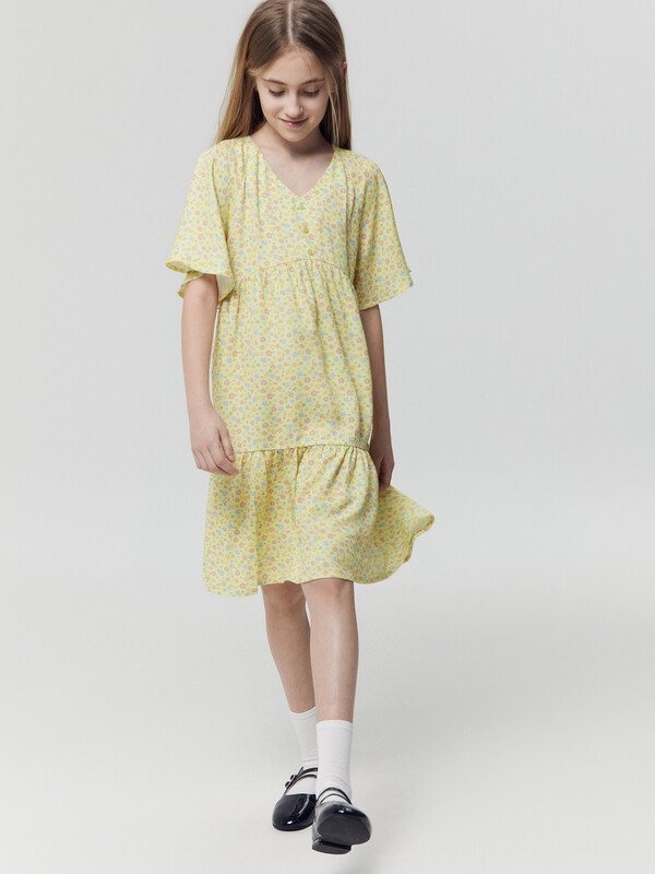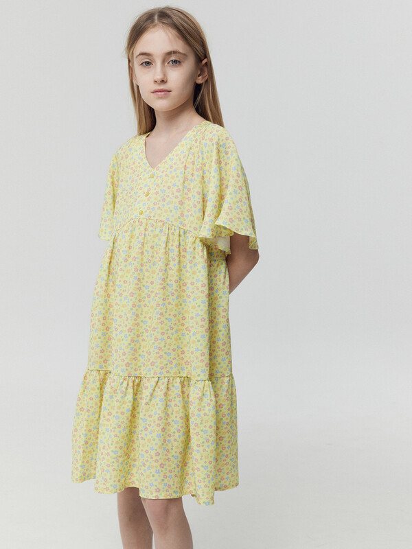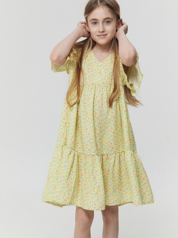Легкое детское платье А-силуэта с отрезными воланами для девочек. Треугольный вырез горловины. Короткие рукава-крылышки покроя реглан. Низ лифа фигурный. По переду лифа пришиты три пуговицы в качестве декора. Материал очень приятный к телу, хорошо пропускает воздух, что позволяет чувствовать комфорт даже в жаркую погоду. Мягкое, слегка эластичное, комфортно сидит по фигуре, не стесняет движений. Представлено в широком размерном ряду и цветовой палитре. Модное и невероятно красивое. Подходит для девочек на каждый день в теплое время года. Рекомендуем!