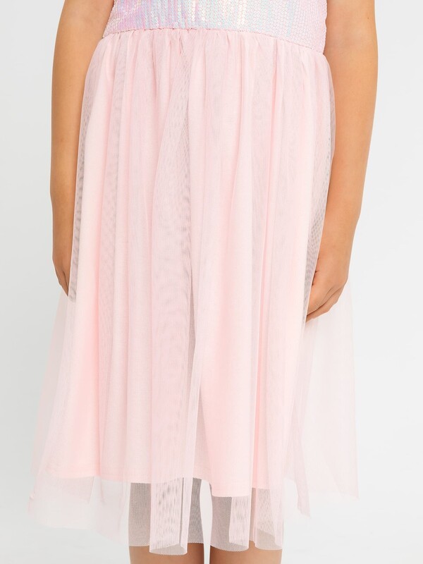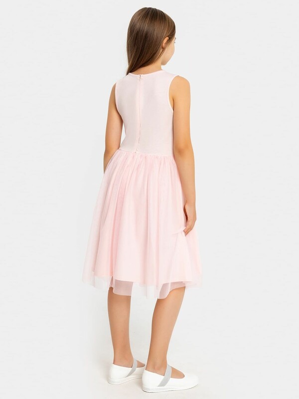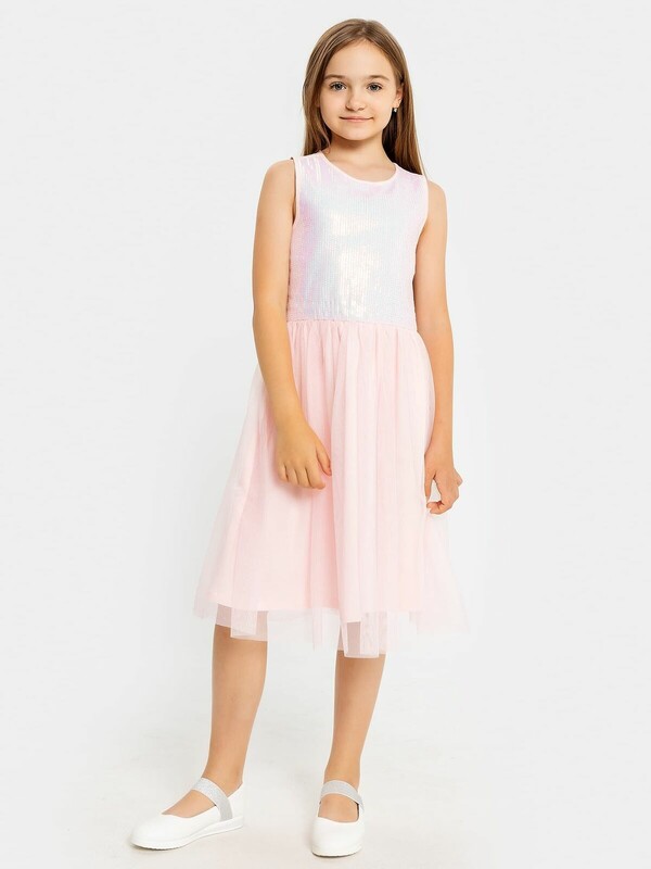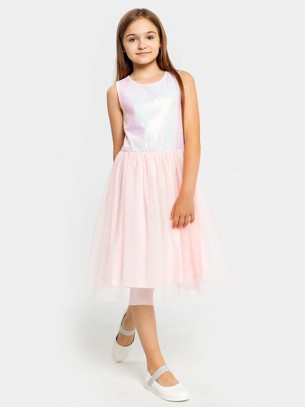 Длина выше колена. Горловина по переду круглая, а по спинке с V-образным вырезом. Лиф изделия выполнен из полотна трикотажного сетки с пайетками, подкладка из полотна трикотажного кулирного. По спинке застежка на потайную молнию. Юбка трехслойная на сборке. Верхние два слоя из полотна трикотажного сетки, подкладка из полотна трикотажного кулирного. Низ подкладки обработан на 2х игольной плоскошовной машине. Первый слой сетки юбки короче второго.