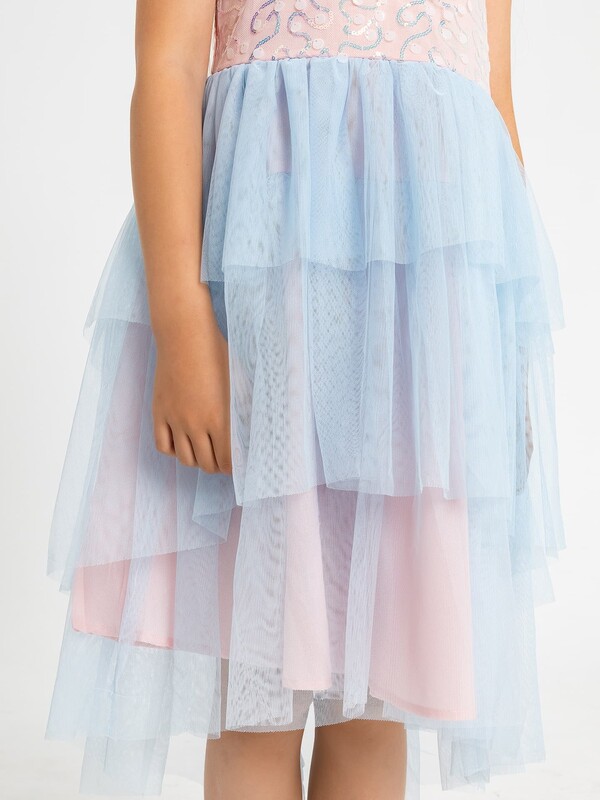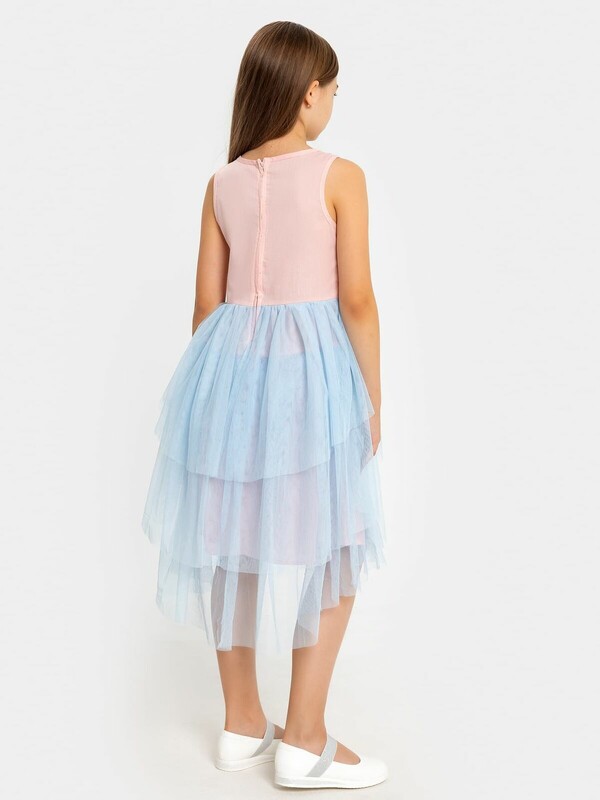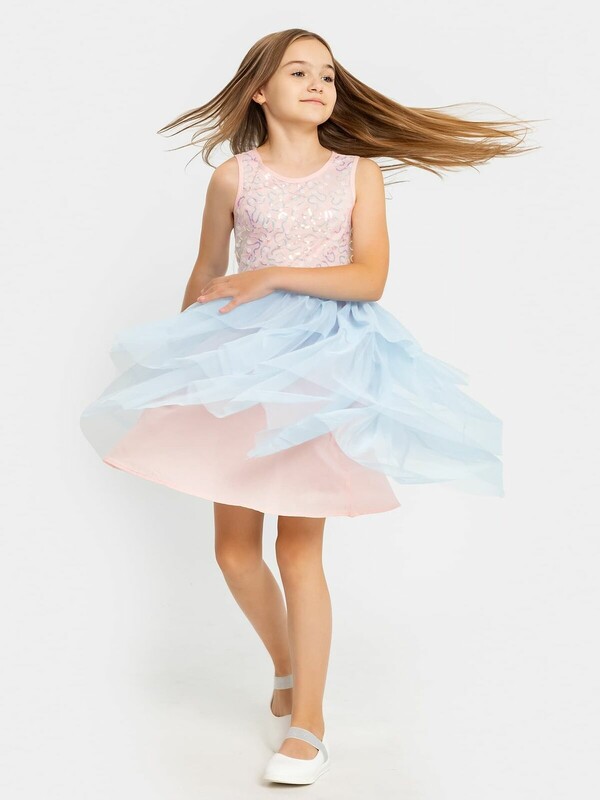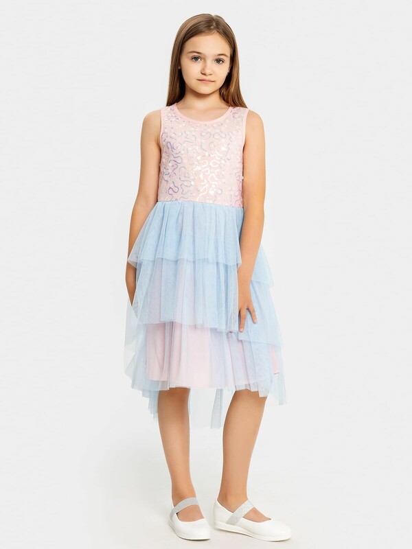 Длина выше колена. Горловина по переду круглая, а по спинке с V-образным вырезом. Лиф изделия выполнен из полотна трикотажного сетки с пайетками, подкладка из полотна трикотажного кулирного. По спинке застежка на потайную молнию. Юбка трехслойная на сборке. Верхние два слоя из полотна трикотажного сетки, подкладка из полотна трикотажного кулирного. Низ подкладки обработан на 2х игольной плоскошовной машине. Первый слой сетки юбки короче второго. верх: 100% полиэстер; подкладка: 100% хлопок Комментарии к товару