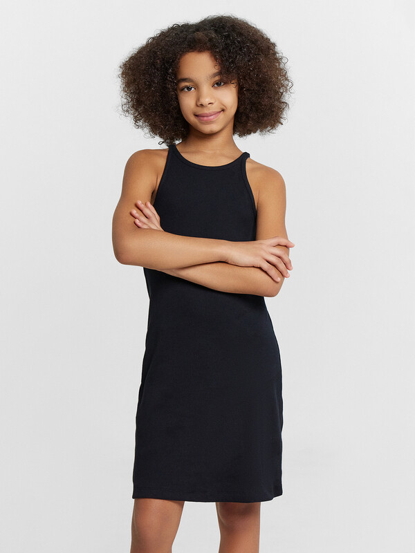 Платье для девочек полуприлегающего силуэта без рукавов. Горловина круглая. Горловина и проймы окантованы бейкой из основного полотна. Низ платья обработан швом вподгибку на 2-ух игольной плоскошовной машине.