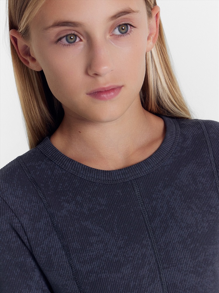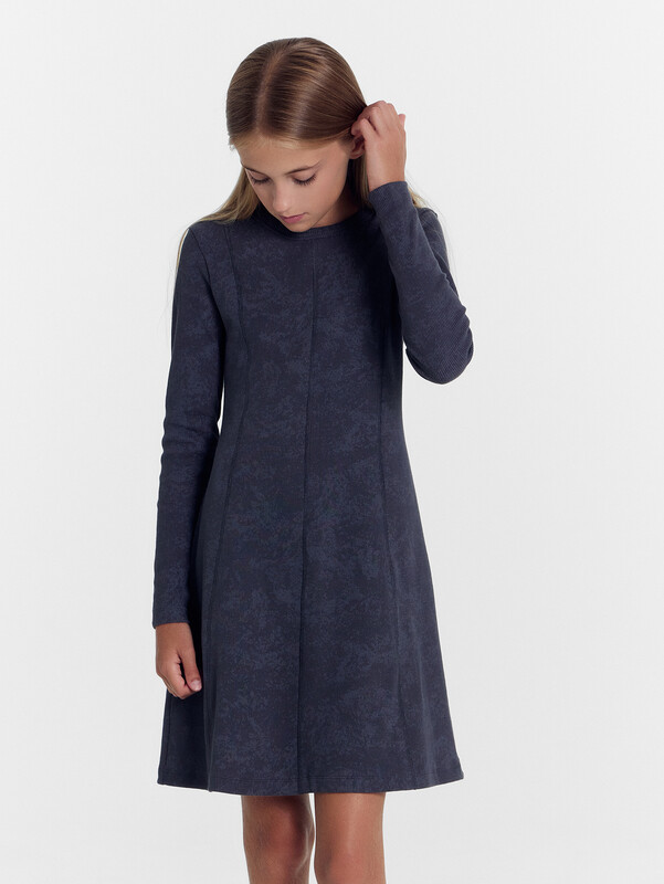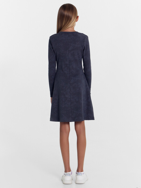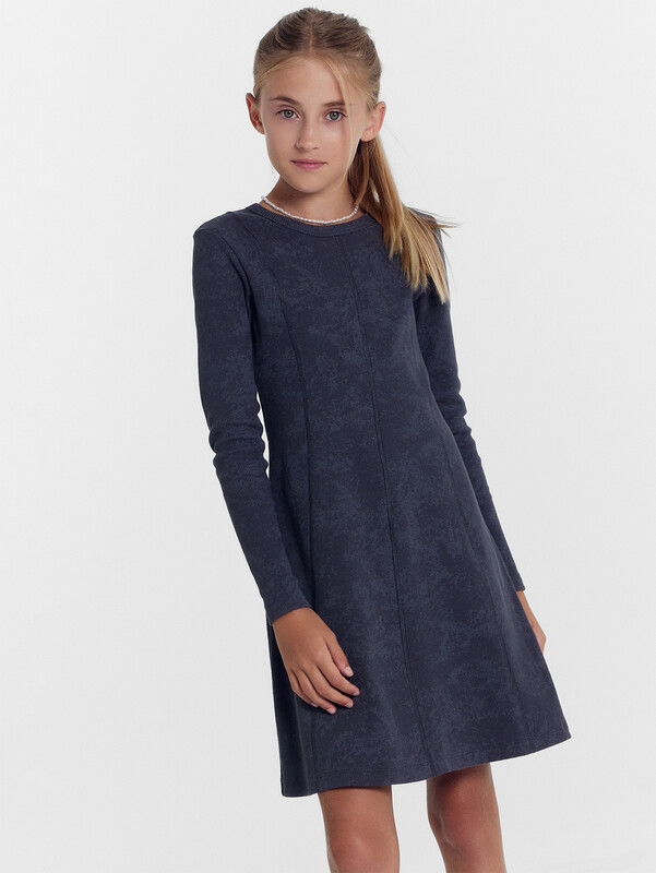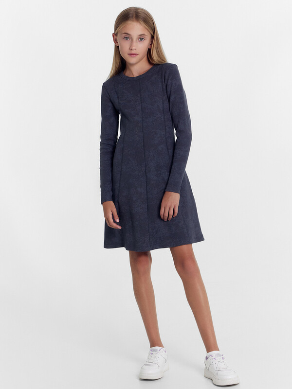 Производитель: Mark Formelle Платье для девочек прилегающего силуэта из трикотажного полотна рибана. Горловина круглой формы обтачка из основного полотна. На детали переда декоративные членения. Рукав втачной, длинный, узкий. Платье к низу расширяется. Низ изделия и руковов обработаны швом в подгибку.