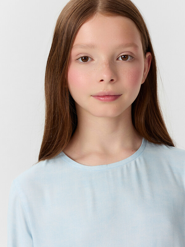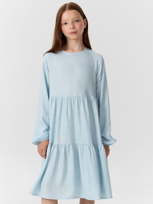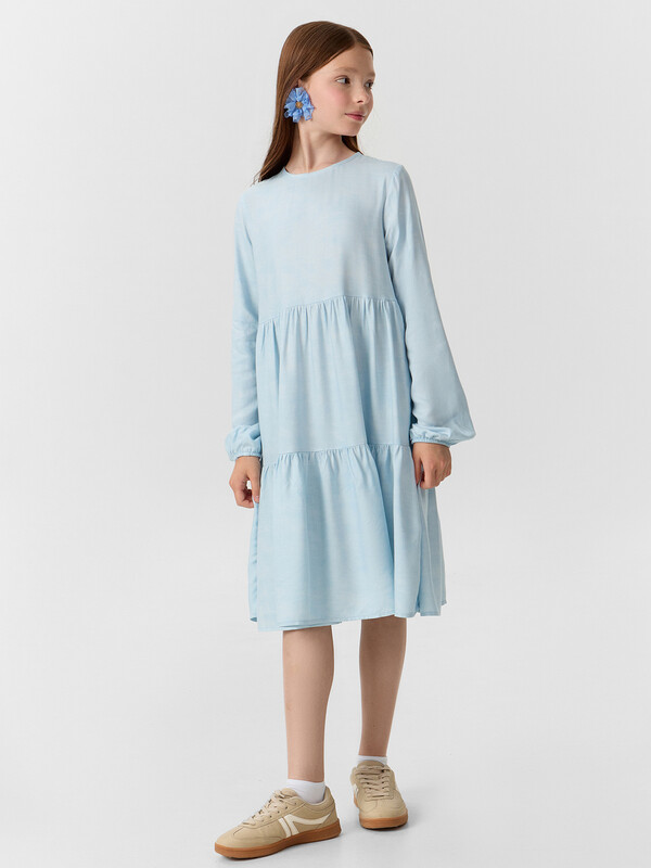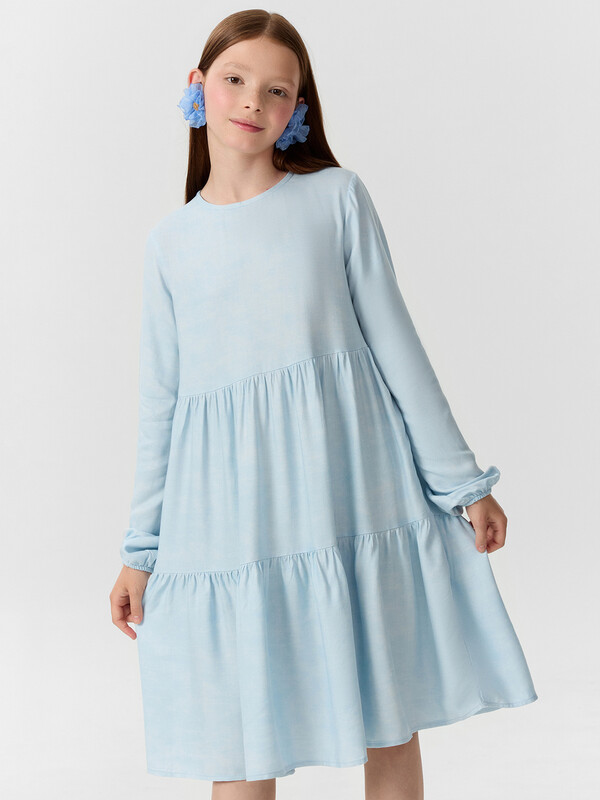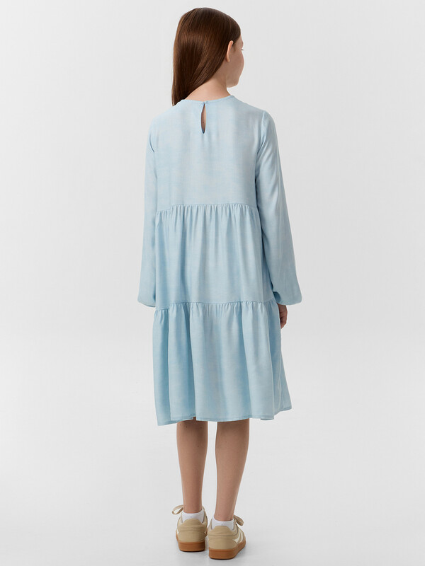 Платье А-силуэта с отрезными воланами. Горловина круглая обработана бейкой в чистый край. На спинкке по горловине разрез, обработаный обтачкой, с пуговицей 10мм и петлей из жилки вязаной 4мм (13797K, KT1-4). Рукав длинный втачной. По низу рукавов внутрь застрочена эластичная тесьма 8RV.