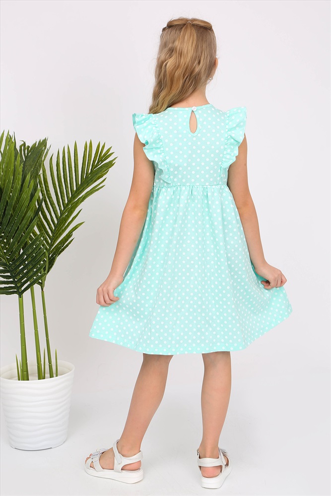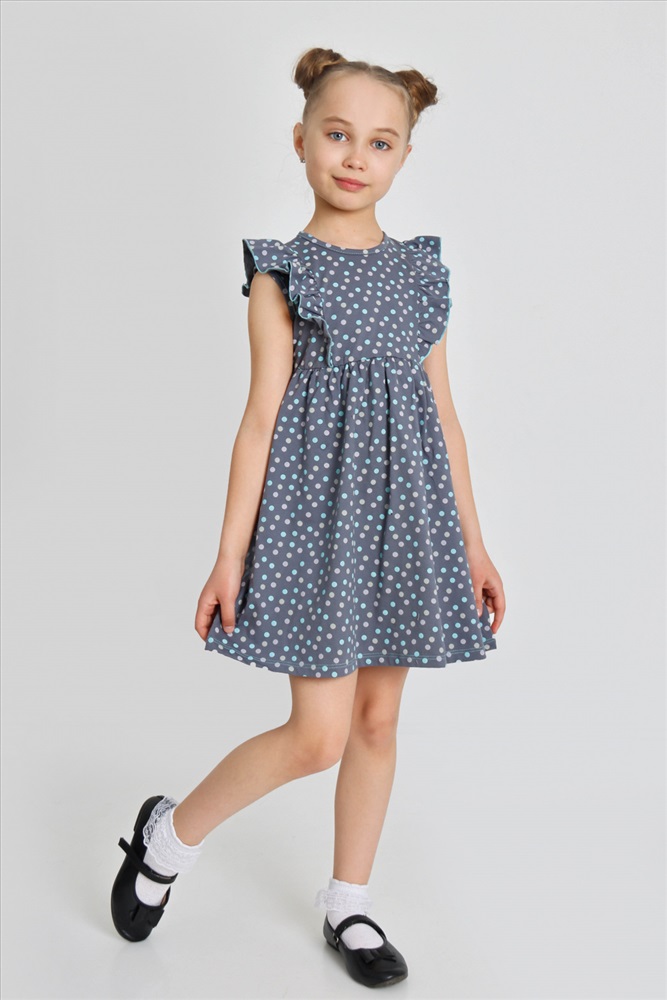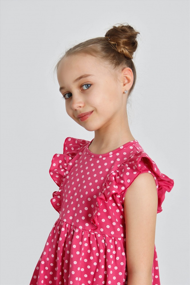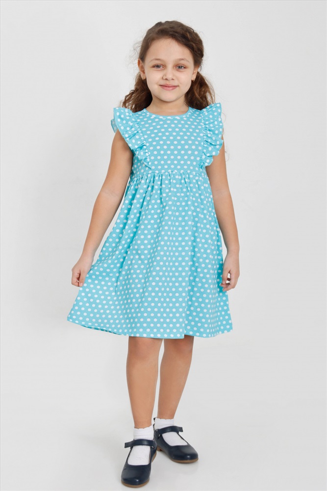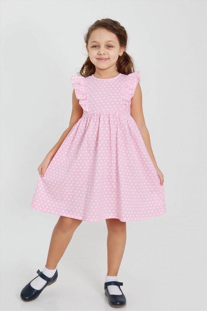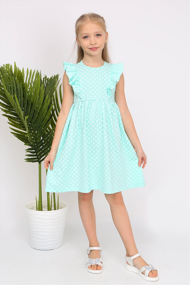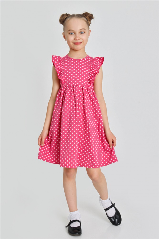 Застежка: пуговицы Платье из кулирки. Силуэт приталенный с юбкой на сборке. Спереди и на спинке рельефы с оборками, без рукава, горловина и проймы окантованы, на спинке капелька с пуговицей. Подходит для жаркой погоды.