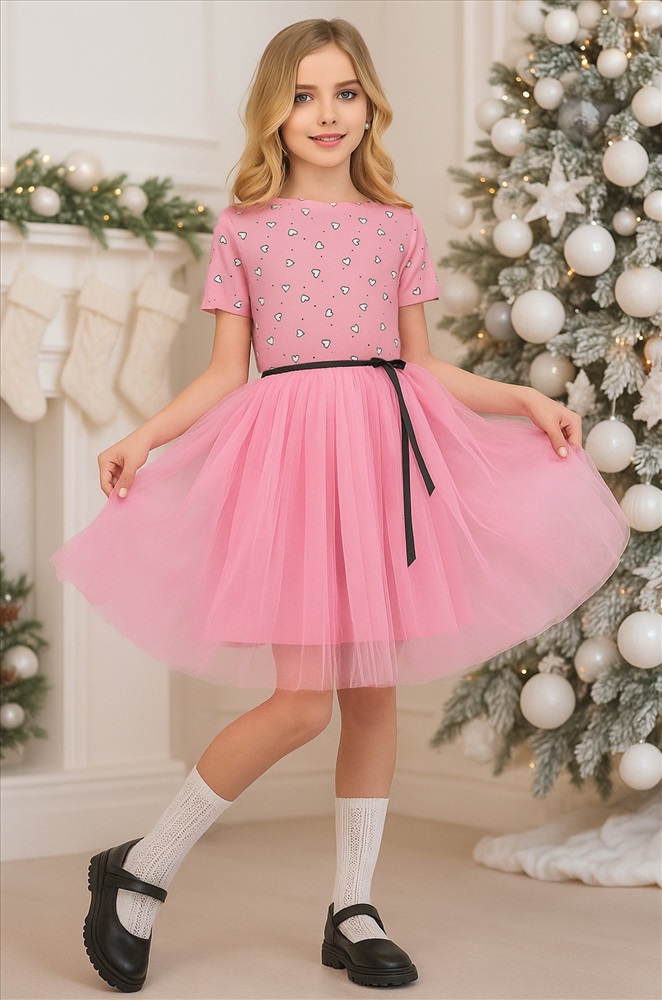 Преимущества: — праздничное платье длины мини выполнено из мягкого хлопкового трикотажа в рубчик с добавлением полиэстера и эластана, что дарит комфорт и свободу движений; — модель имеет фатиновую юбку с подкладкой из 100% хлопка, благодаря чему новогоднее платье выглядит воздушным; — короткие рукава и горловина с волнистыми краями придают изысканность и нежность; — пышная юбкa и акцентный пояс подчеркивают талию и делают силуэт гармоничным; — принт сердечки на фактурной ткани лапша добавляет образу романтичности и очарования. Розовое платье — это нежность, уют и торжественность в одном образе. Вечернее воздушное платье идеально подойдет для выступлений в садике или празднования Нового года.