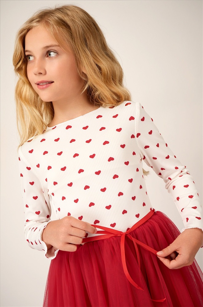 — принт сердечки на фактурной ткани лапша добавляет образу романтичности и очарования.