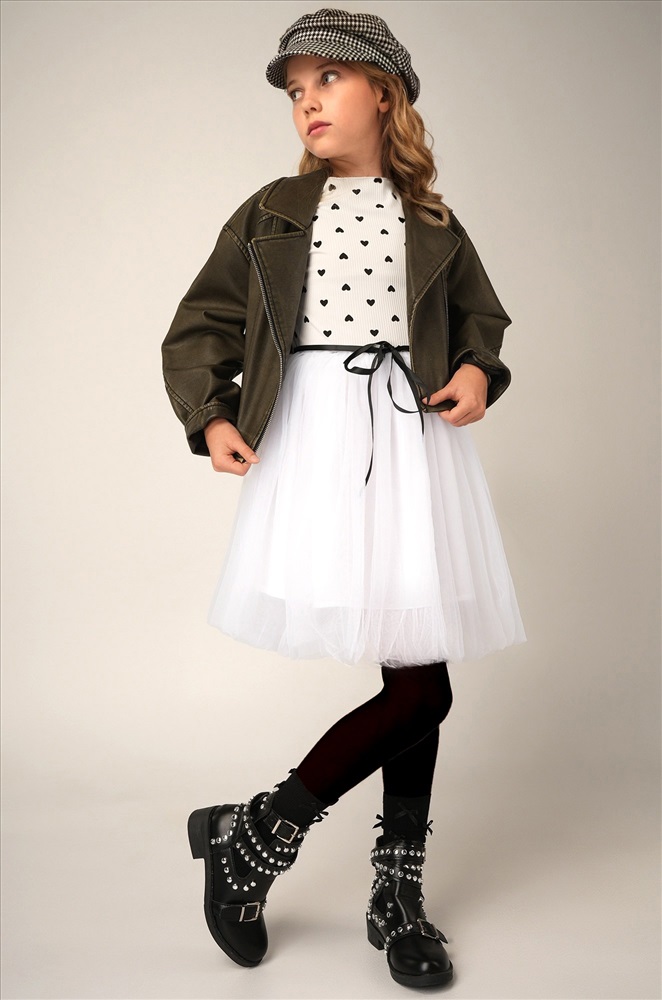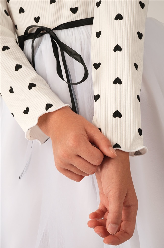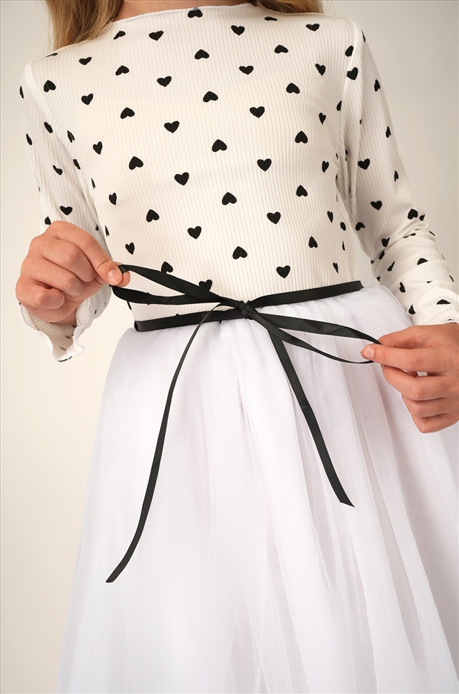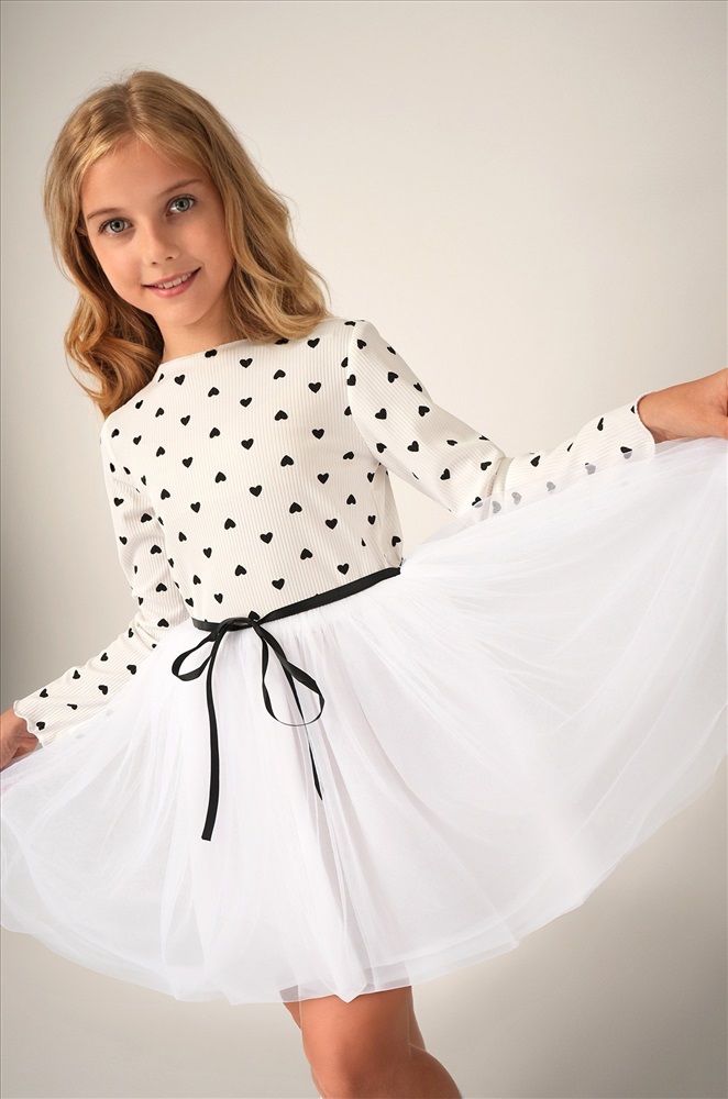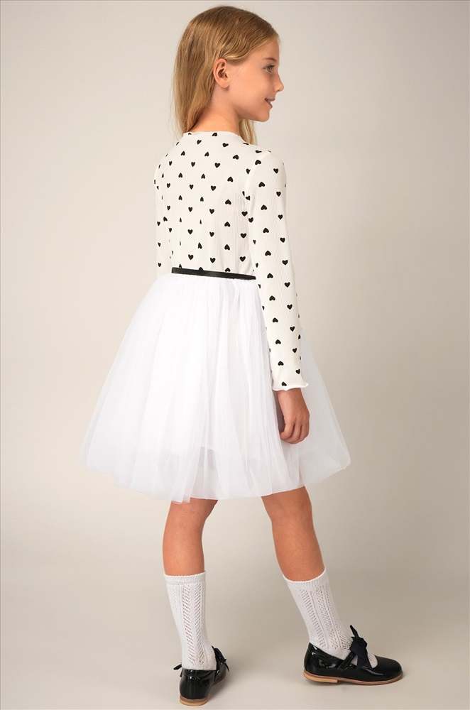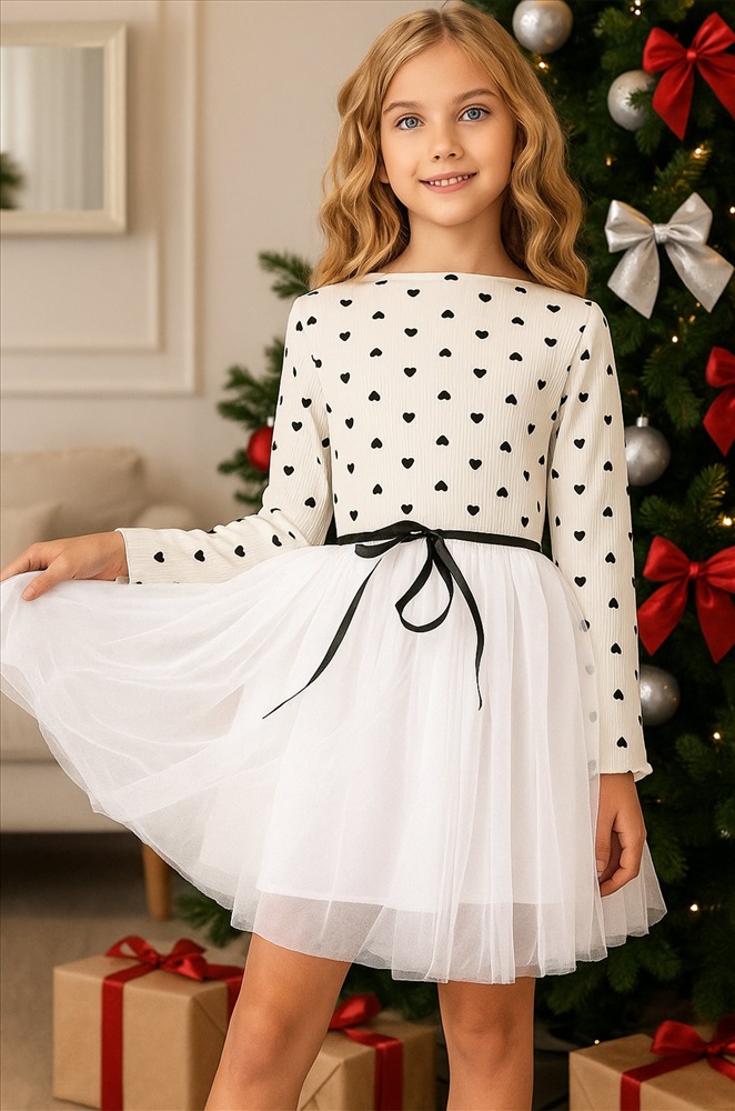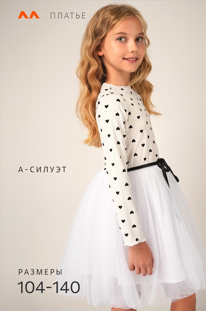 Преимущества: — праздничное платье длины мини выполнено из мягкого хлопкового трикотажа в рубчик с добавлением полиэстера и эластана, что дарит комфорт и свободу движений; — модель имеет фатиновую юбку с подкладкой из 100% хлопка, благодаря чему новогоднее платье выглядит воздушным; — длинные рукава и горловина с волнистыми краями придают изысканность и нежность; — пышная юбкa и акцентный пояс подчеркивают талию и делают силуэт гармоничным; — принт сердечки на фактурной ткани лапша добавляет образу романтичности и очарования. Белое платье — это нежность, уют и торжественность в одном образе. Вечернее воздушное платье идеально подойдет для выступлений в садике или празднования Нового года.
