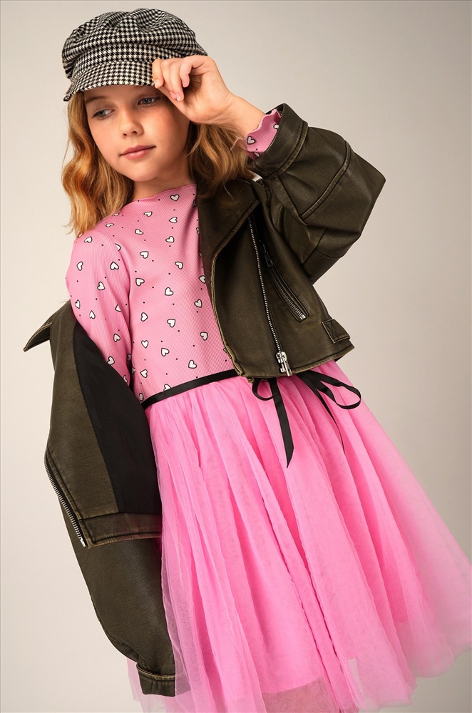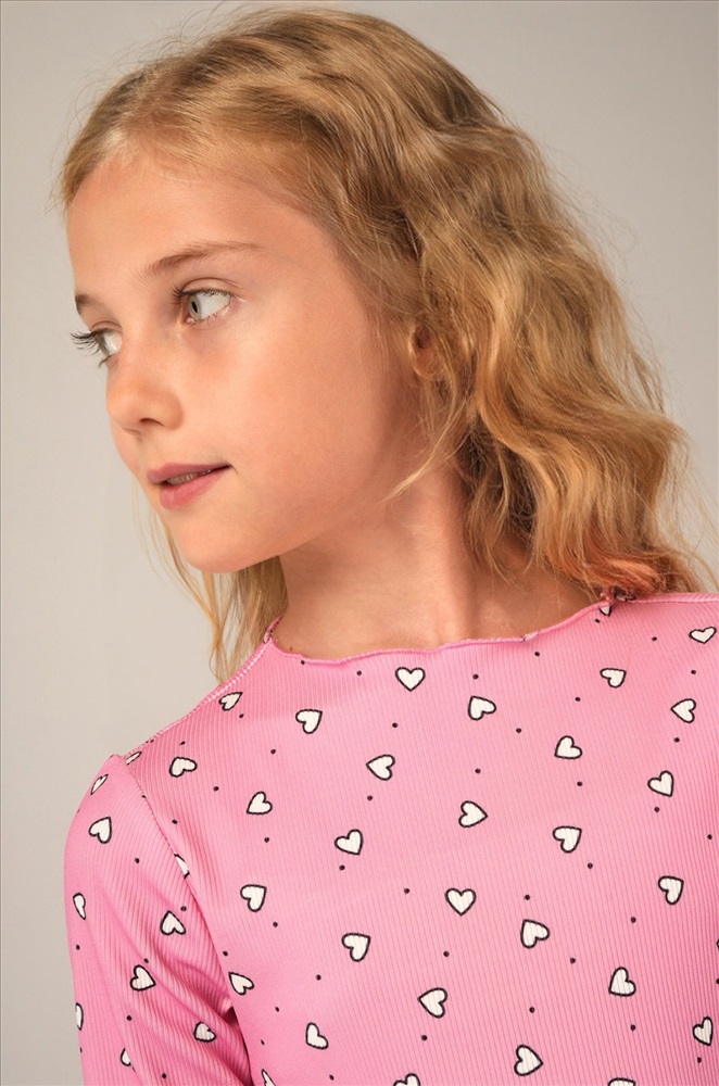 — принт сердечки на фактурной ткани лапша добавляет образу романтичности и очарования.
